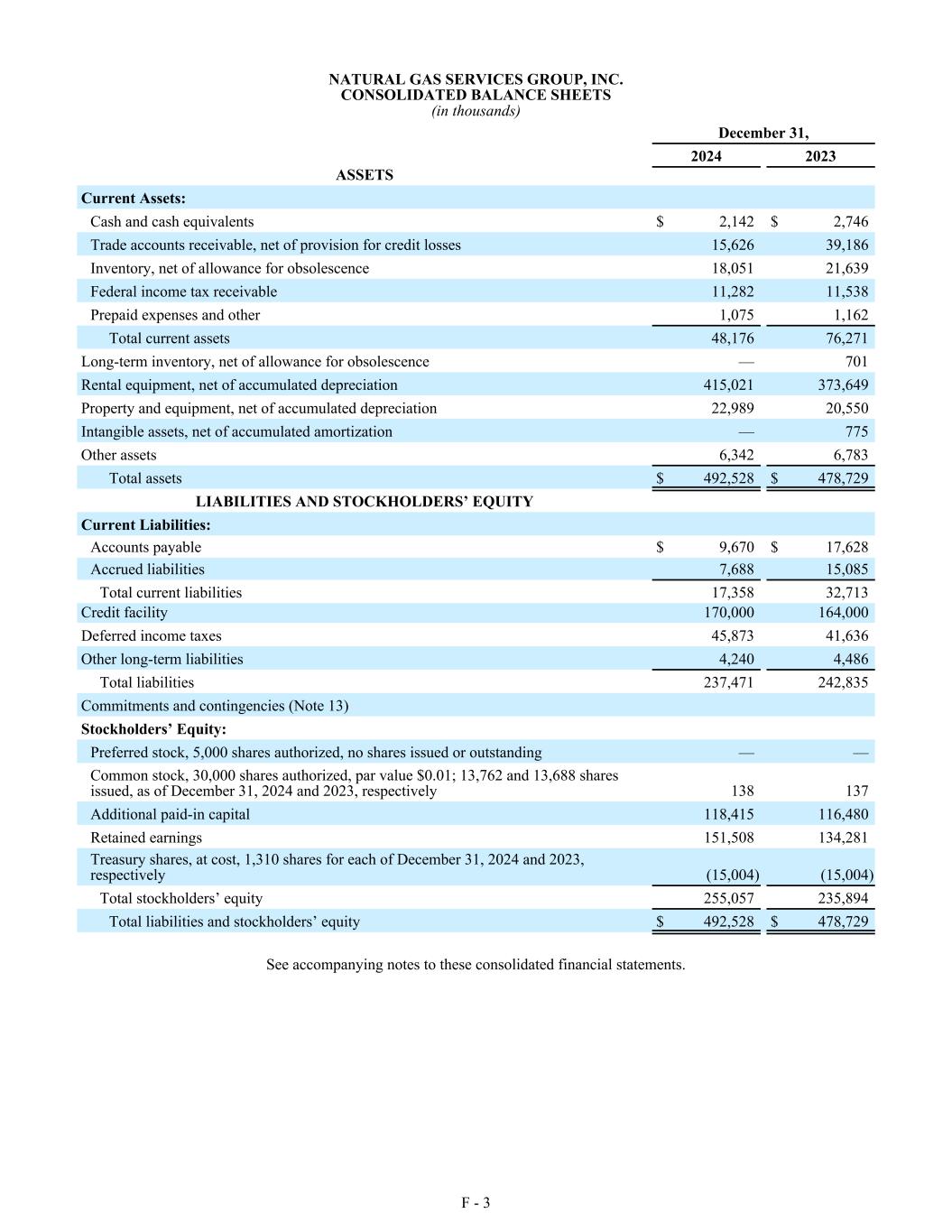 NATURAL GAS SERVICES GROUP, INC. CONSOLIDATED BALANCE SHEETS (in thousands) December 31, 2024 2023 ASSETS Current Assets: Cash and cash equivalents $ 2,142 $ 2,746 Trade accounts receivable, net of provision for credit losses 15,626 39,186 Inventory, net of allowance for obsolescence 18,051 21,639 Federal income tax receivable 11,282 11,538 Prepaid expenses and other 1,075 1,162 Total current assets 48,176 76,271 Long-term inventory, net of allowance for obsolescence — 701 Rental equipment, net of accumulated depreciation 415,021 373,649 Property and equipment, net of accumulated depreciation 22,989 20,550 Intangible assets, net of accumulated amortization — 775 Other assets 6,342 6,783 Total assets $ 492,528 $ 478,729 LIABILITIES AND STOCKHOLDERS’ EQUITY Current Liabilities: Accounts payable $ 9,670 $ 17,628 Accrued liabilities 7,688 15,085 Total current liabilities 17,358 32,713 Credit facility 170,000 164,000 Deferred income taxes 45,873 41,636 Other long-term liabilities 4,240 4,486 Total liabilities 237,471 242,835 Commitments and contingencies (Note 13) Stockholders’ Equity: Preferred stock, 5,000 shares authorized, no shares issued or outstanding — — Common stock, 30,000 shares authorized, par value $0.01; 13,762 and 13,688 shares issued, as of December 31, 2024 and 2023, respectively 138 137 Additional paid-in capital 118,415 116,480 Retained earnings 151,508 134,281 Treasury shares, at cost, 1,310 shares for each of December 31, 2024 and 2023, respectively (15,004) (15,004) Total stockholders’ equity 255,057 235,894 Total liabilities and stockholders’ equity $ 492,528 $ 478,729 See accompanying notes to these consolidated financial statements. F - 3