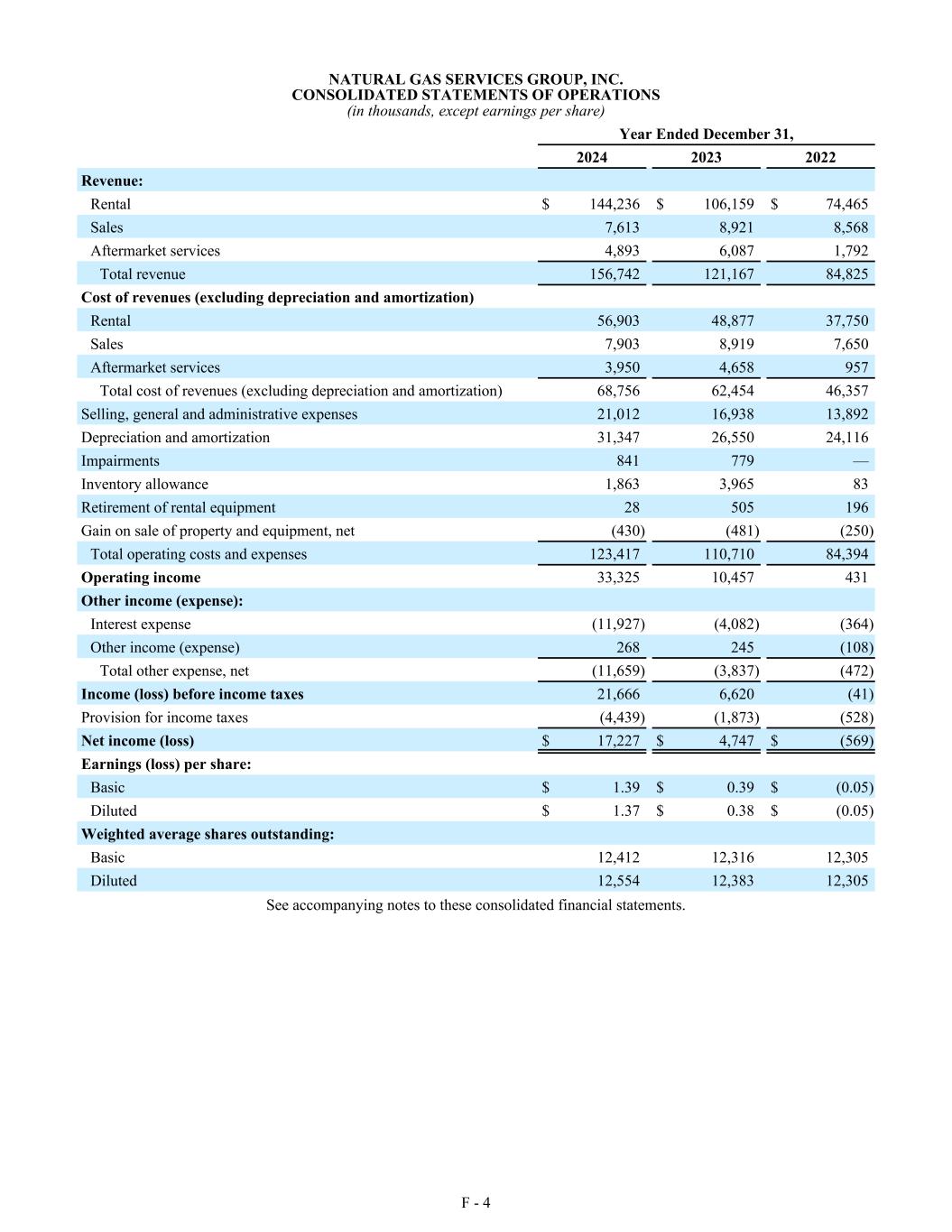 NATURAL GAS SERVICES GROUP, INC. CONSOLIDATED STATEMENTS OF OPERATIONS (in thousands, except earnings per share) Year Ended December 31, 2024 2023 2022 Revenue: Rental $ 144,236 $ 106,159 $ 74,465 Sales 7,613 8,921 8,568 Aftermarket services 4,893 6,087 1,792 Total revenue 156,742 121,167 84,825 Cost of revenues (excluding depreciation and amortization) Rental 56,903 48,877 37,750 Sales 7,903 8,919 7,650 Aftermarket services 3,950 4,658 957 Total cost of revenues (excluding depreciation and amortization) 68,756 62,454 46,357 Selling, general and administrative expenses 21,012 16,938 13,892 Depreciation and amortization 31,347 26,550 24,116 Impairments 841 779 — Inventory allowance 1,863 3,965 83 Retirement of rental equipment 28 505 196 Gain on sale of property and equipment, net (430) (481) (250) Total operating costs and expenses 123,417 110,710 84,394 Operating income 33,325 10,457 431 Other income (expense): Interest expense (11,927) (4,082) (364) Other income (expense) 268 245 (108) Total other expense, net (11,659) (3,837) (472) Income (loss) before income taxes 21,666 6,620 (41) Provision for income taxes (4,439) (1,873) (528) Net income (loss) $ 17,227 $ 4,747 $ (569) Earnings (loss) per share: Basic $ 1.39 $ 0.39 $ (0.05) Diluted $ 1.37 $ 0.38 $ (0.05) Weighted average shares outstanding: Basic 12,412 12,316 12,305 Diluted 12,554 12,383 12,305 See accompanying notes to these consolidated financial statements. F - 4