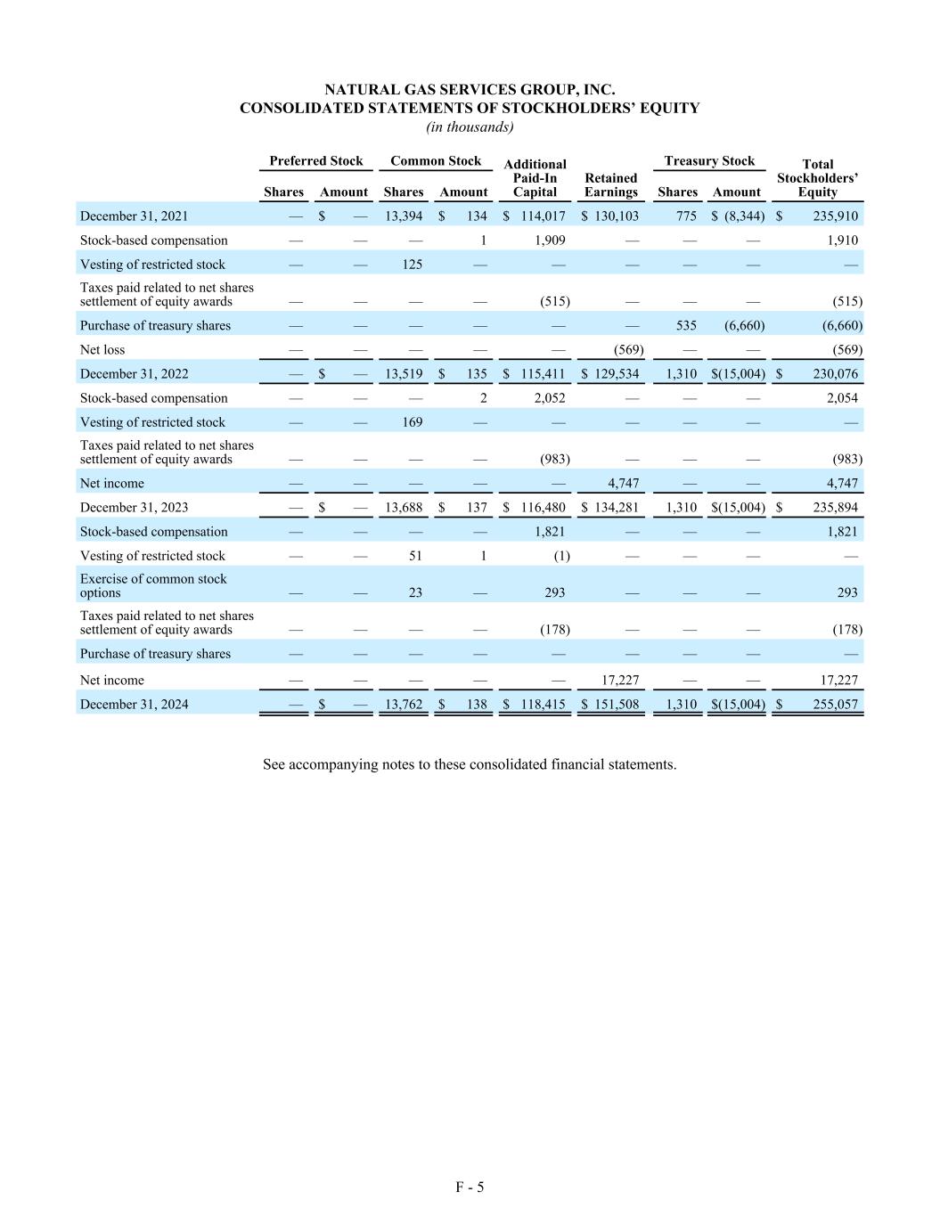 NATURAL GAS SERVICES GROUP, INC. CONSOLIDATED STATEMENTS OF STOCKHOLDERS’ EQUITY (in thousands) Preferred Stock Common Stock Additional Paid-In Capital Retained Earnings Treasury Stock Total Stockholders’ EquityShares Amount Shares Amount Shares Amount December 31, 2021 — $ — 13,394 $ 134 $ 114,017 $ 130,103 775 $ (8,344) $ 235,910 Stock-based compensation — — — 1 1,909 — — — 1,910 Vesting of restricted stock — — 125 — — — — — — Taxes paid related to net shares settlement of equity awards — — — — (515) — — — (515) Purchase of treasury shares — — — — — — 535 (6,660) (6,660) Net loss — — — — — (569) — — (569) December 31, 2022 — $ — 13,519 $ 135 $ 115,411 $ 129,534 1,310 $ (15,004) $ 230,076 Stock-based compensation — — — 2 2,052 — — — 2,054 Vesting of restricted stock — — 169 — — — — — — Taxes paid related to net shares settlement of equity awards — — — — (983) — — — (983) Net income — — — — — 4,747 — — 4,747 December 31, 2023 — $ — 13,688 $ 137 $ 116,480 $ 134,281 1,310 $ (15,004) $ 235,894 Stock-based compensation — — — — 1,821 — — — 1,821 Vesting of restricted stock — — 51 1 (1) — — — — Exercise of common stock options — — 23 — 293 — — — 293 Taxes paid related to net shares settlement of equity awards — — — — (178) — — — (178) Purchase of treasury shares — — — — — — — — — Net income — — — — — 17,227 — — 17,227 December 31, 2024 — $ — 13,762 $ 138 $ 118,415 $ 151,508 1,310 $ (15,004) $ 255,057 See accompanying notes to these consolidated financial statements. F - 5