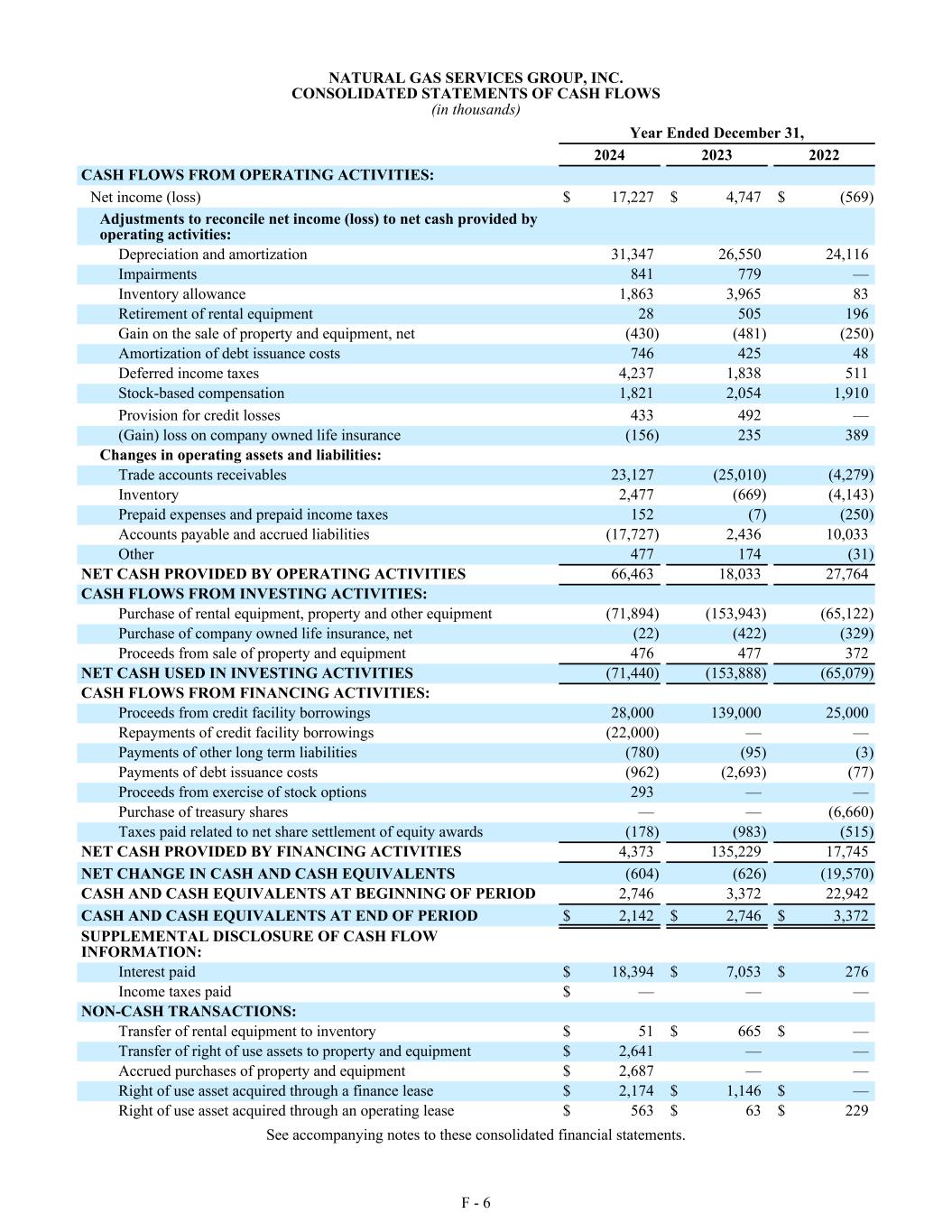 NATURAL GAS SERVICES GROUP, INC. CONSOLIDATED STATEMENTS OF CASH FLOWS (in thousands) Year Ended December 31, 2024 2023 2022 CASH FLOWS FROM OPERATING ACTIVITIES: Net income (loss) $ 17,227 $ 4,747 $ (569) Adjustments to reconcile net income (loss) to net cash provided by operating activities: Depreciation and amortization 31,347 26,550 24,116 Impairments 841 779 — Inventory allowance 1,863 3,965 83 Retirement of rental equipment 28 505 196 Gain on the sale of property and equipment, net (430) (481) (250) Amortization of debt issuance costs 746 425 48 Deferred income taxes 4,237 1,838 511 Stock-based compensation 1,821 2,054 1,910 Provision for credit losses 433 492 — (Gain) loss on company owned life insurance (156) 235 389 Changes in operating assets and liabilities: Trade accounts receivables 23,127 (25,010) (4,279) Inventory 2,477 (669) (4,143) Prepaid expenses and prepaid income taxes 152 (7) (250) Accounts payable and accrued liabilities (17,727) 2,436 10,033 Other 477 174 (31) NET CASH PROVIDED BY OPERATING ACTIVITIES 66,463 18,033 27,764 CASH FLOWS FROM INVESTING ACTIVITIES: Purchase of rental equipment, property and other equipment (71,894) (153,943) (65,122) Purchase of company owned life insurance, net (22) (422) (329) Proceeds from sale of property and equipment 476 477 372 NET CASH USED IN INVESTING ACTIVITIES (71,440) (153,888) (65,079) CASH FLOWS FROM FINANCING ACTIVITIES: Proceeds from credit facility borrowings 28,000 139,000 25,000 Repayments of credit facility borrowings (22,000) — — Payments of other long term liabilities (780) (95) (3) Payments of debt issuance costs (962) (2,693) (77) Proceeds from exercise of stock options 293 — — Purchase of treasury shares — — (6,660) Taxes paid related to net share settlement of equity awards (178) (983) (515) NET CASH PROVIDED BY FINANCING ACTIVITIES 4,373 135,229 17,745 NET CHANGE IN CASH AND CASH EQUIVALENTS (604) (626) (19,570) CASH AND CASH EQUIVALENTS AT BEGINNING OF PERIOD 2,746 3,372 22,942 CASH AND CASH EQUIVALENTS AT END OF PERIOD $ 2,142 $ 2,746 $ 3,372 SUPPLEMENTAL DISCLOSURE OF CASH FLOW INFORMATION: Interest paid $ 18,394 $ 7,053 $ 276 Income taxes paid $ — — — NON-CASH TRANSACTIONS: Transfer of rental equipment to inventory $ 51 $ 665 $ — Transfer of right of use assets to property and equipment $ 2,641 — — Accrued purchases of property and equipment $ 2,687 — — Right of use asset acquired through a finance lease $ 2,174 $ 1,146 $ — Right of use asset acquired through an operating lease $ 563 $ 63 $ 229 See accompanying notes to these consolidated financial statements. F - 6