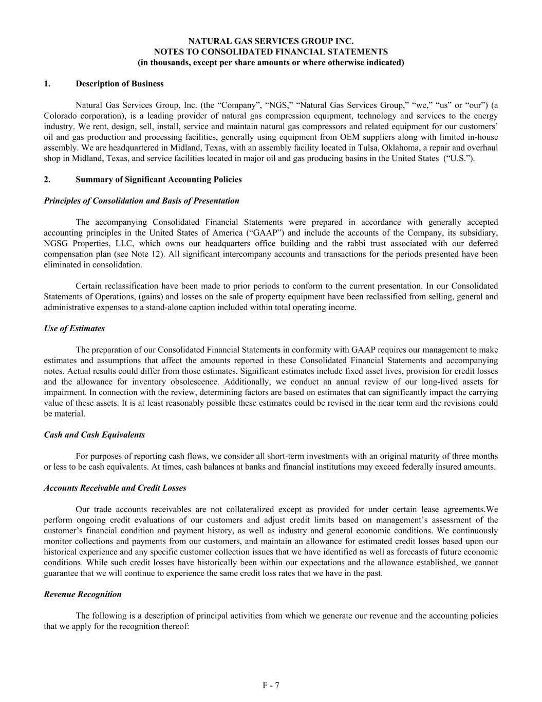 NATURAL GAS SERVICES GROUP INC. NOTES TO CONSOLIDATED FINANCIAL STATEMENTS (in thousands, except per share amounts or where otherwise indicated) 1. Description of Business Natural Gas Services Group, Inc. (the “Company”, “NGS,” “Natural Gas Services Group,” “we,” “us” or “our”) (a Colorado corporation), is a leading provider of natural gas compression equipment, technology and services to the energy industry. We rent, design, sell, install, service and maintain natural gas compressors and related equipment for our customers’ oil and gas production and processing facilities, generally using equipment from OEM suppliers along with limited in-house assembly. We are headquartered in Midland, Texas, with an assembly facility located in Tulsa, Oklahoma, a repair and overhaul shop in Midland, Texas, and service facilities located in major oil and gas producing basins in the United States (“U.S.”). 2. Summary of Significant Accounting Policies Principles of Consolidation and Basis of Presentation The accompanying Consolidated Financial Statements were prepared in accordance with generally accepted accounting principles in the United States of America (“GAAP”) and include the accounts of the Company, its subsidiary, NGSG Properties, LLC, which owns our headquarters office building and the rabbi trust associated with our deferred compensation plan (see Note 12). All significant intercompany accounts and transactions for the periods presented have been eliminated in consolidation. Certain reclassification have been made to prior periods to conform to the current presentation. In our Consolidated Statements of Operations, (gains) and losses on the sale of property equipment have been reclassified from selling, general and administrative expenses to a stand-alone caption included within total operating income. Use of Estimates The preparation of our Consolidated Financial Statements in conformity with GAAP requires our management to make estimates and assumptions that affect the amounts reported in these Consolidated Financial Statements and accompanying notes. Actual results could differ from those estimates. Significant estimates include fixed asset lives, provision for credit losses and the allowance for inventory obsolescence. Additionally, we conduct an annual review of our long-lived assets for impairment. In connection with the review, determining factors are based on estimates that can significantly impact the carrying value of these assets. It is at least reasonably possible these estimates could be revised in the near term and the revisions could be material. Cash and Cash Equivalents For purposes of reporting cash flows, we consider all short-term investments with an original maturity of three months or less to be cash equivalents. At times, cash balances at banks and financial institutions may exceed federally insured amounts. Accounts Receivable and Credit Losses Our trade accounts receivables are not collateralized except as provided for under certain lease agreements.We perform ongoing credit evaluations of our customers and adjust credit limits based on management’s assessment of the customer’s financial condition and payment history, as well as industry and general economic conditions. We continuously monitor collections and payments from our customers, and maintain an allowance for estimated credit losses based upon our historical experience and any specific customer collection issues that we have identified as well as forecasts of future economic conditions. While such credit losses have historically been within our expectations and the allowance established, we cannot guarantee that we will continue to experience the same credit loss rates that we have in the past. Revenue Recognition The following is a description of principal activities from which we generate our revenue and the accounting policies that we apply for the recognition thereof: F - 7