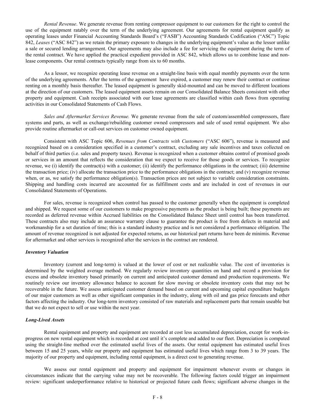 Rental Revenue. We generate revenue from renting compressor equipment to our customers for the right to control the use of the equipment ratably over the term of the underlying agreement. Our agreements for rental equipment qualify as operating leases under Financial Accounting Standards Board’s (“FASB”) Accounting Standards Codification (“ASC”) Topic 842, Leases (“ASC 842”) as we retain the primary exposure to changes in the underlying equipment’s value as the lessor unlike a sale or secured lending arrangement. Our agreements may also include a fee for servicing the equipment during the term of the rental contract. We have applied the practical expedient provided in ASC 842, which allows us to combine lease and non- lease components. Our rental contracts typically range from six to 60 months. As a lessor, we recognize operating lease revenue on a straight-line basis with equal monthly payments over the term of the underlying agreements. After the terms of the agreement have expired, a customer may renew their contract or continue renting on a monthly basis thereafter. The leased equipment is generally skid-mounted and can be moved to different locations at the direction of our customers. The leased equipment assets remain on our Consolidated Balance Sheets consistent with other property and equipment. Cash receipts associated with our lease agreements are classified within cash flows from operating activities in our Consolidated Statements of Cash Flows. Sales and Aftermarket Services Revenue. We generate revenue from the sale of custom/assembled compressors, flare systems and parts, as well as exchange/rebuilding customer owned compressors and sale of used rental equipment. We also provide routine aftermarket or call-out services on customer owned equipment. Consistent with ASC Topic 606, Revenues from Contracts with Customers (“ASC 606”), revenue is measured and recognized based on a consideration specified in a customer’s contract, excluding any sale incentives and taxes collected on behalf of third parties (i.e. sales and property taxes). Revenue is recognized when a customer obtains control of promised goods or services in an amount that reflects the consideration that we expect to receive for those goods or services. To recognize revenue, we (i) identify the contract(s) with a customer; (ii) identify the performance obligations in the contract; (iii) determine the transaction price; (iv) allocate the transaction price to the performance obligations in the contract; and (v) recognize revenue when, or as, we satisfy the performance obligation(s). Transaction prices are not subject to variable consideration constraints. Shipping and handling costs incurred are accounted for as fulfillment costs and are included in cost of revenues in our Consolidated Statements of Operations. For sales, revenue is recognized when control has passed to the customer generally when the equipment is completed and shipped. We request some of our customers to make progressive payments as the product is being built; these payments are recorded as deferred revenue within Accrued liabilities on the Consolidated Balance Sheet until control has been transferred. These contracts also may include an assurance warranty clause to guarantee the product is free from defects in material and workmanship for a set duration of time; this is a standard industry practice and is not considered a performance obligation. The amount of revenue recognized is not adjusted for expected returns, as our historical part returns have been de minimis. Revenue for aftermarket and other services is recognized after the services in the contract are rendered. Inventory Valuation Inventory (current and long-term) is valued at the lower of cost or net realizable value. The cost of inventories is determined by the weighted average method. We regularly review inventory quantities on hand and record a provision for excess and obsolete inventory based primarily on current and anticipated customer demand and production requirements. We routinely review our inventory allowance balance to account for slow moving or obsolete inventory costs that may not be recoverable in the future. We assess anticipated customer demand based on current and upcoming capital expenditure budgets of our major customers as well as other significant companies in the industry, along with oil and gas price forecasts and other factors affecting the industry. Our long-term inventory consisted of raw materials and replacement parts that remain useable but that we do not expect to sell or use within the next year. Long-Lived Assets Rental equipment and property and equipment are recorded at cost less accumulated depreciation, except for work-in- progress on new rental equipment which is recorded at cost until it’s complete and added to our fleet. Depreciation is computed using the straight-line method over the estimated useful lives of the assets. Our rental equipment has estimated useful lives between 15 and 25 years, while our property and equipment has estimated useful lives which range from 3 to 39 years. The majority of our property and equipment, including rental equipment, is a direct cost to generating revenue. We assess our rental equipment and property and equipment for impairment whenever events or changes in circumstances indicate that the carrying value may not be recoverable. The following factors could trigger an impairment review: significant underperformance relative to historical or projected future cash flows; significant adverse changes in the F - 8