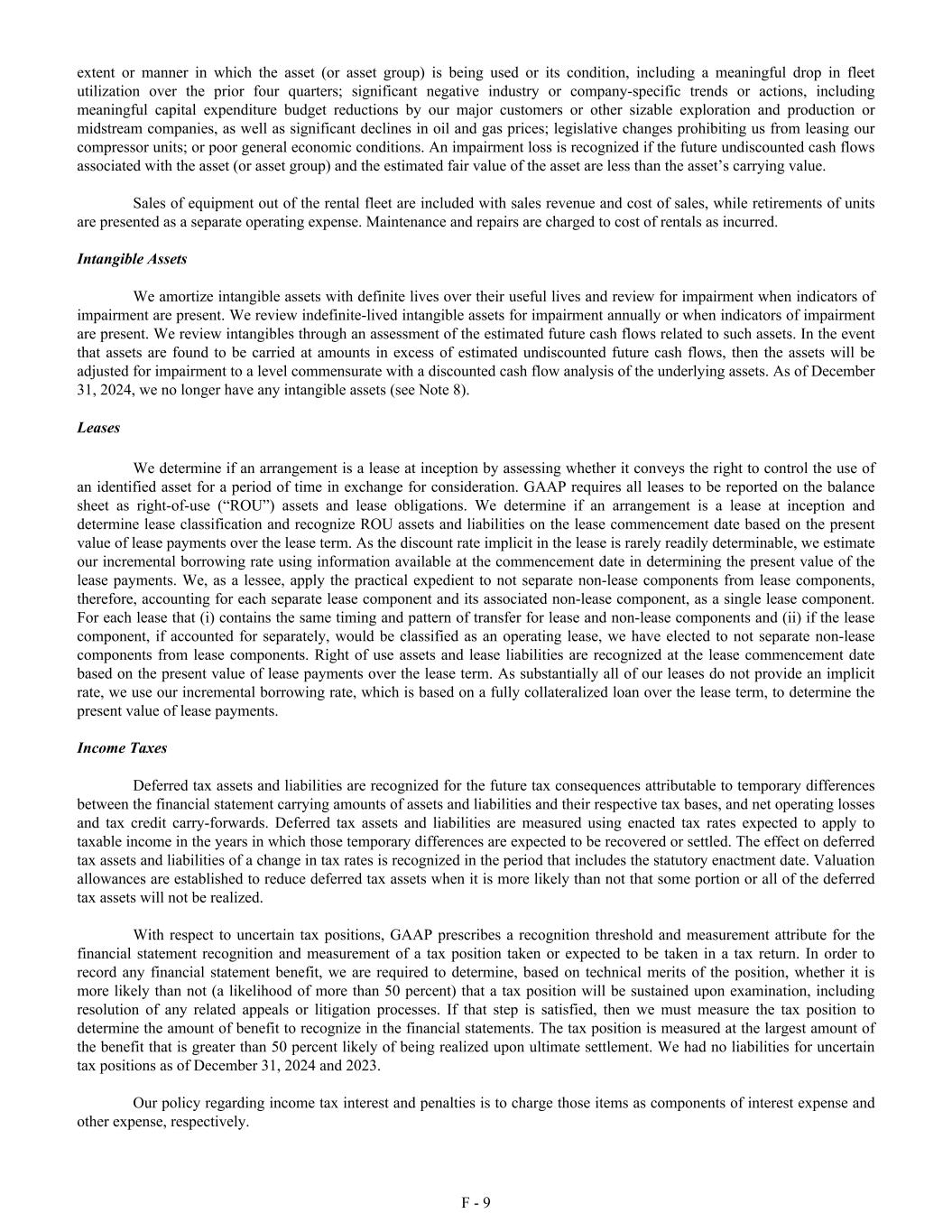 extent or manner in which the asset (or asset group) is being used or its condition, including a meaningful drop in fleet utilization over the prior four quarters; significant negative industry or company-specific trends or actions, including meaningful capital expenditure budget reductions by our major customers or other sizable exploration and production or midstream companies, as well as significant declines in oil and gas prices; legislative changes prohibiting us from leasing our compressor units; or poor general economic conditions. An impairment loss is recognized if the future undiscounted cash flows associated with the asset (or asset group) and the estimated fair value of the asset are less than the asset’s carrying value. Sales of equipment out of the rental fleet are included with sales revenue and cost of sales, while retirements of units are presented as a separate operating expense. Maintenance and repairs are charged to cost of rentals as incurred. Intangible Assets We amortize intangible assets with definite lives over their useful lives and review for impairment when indicators of impairment are present. We review indefinite-lived intangible assets for impairment annually or when indicators of impairment are present. We review intangibles through an assessment of the estimated future cash flows related to such assets. In the event that assets are found to be carried at amounts in excess of estimated undiscounted future cash flows, then the assets will be adjusted for impairment to a level commensurate with a discounted cash flow analysis of the underlying assets. As of December 31, 2024, we no longer have any intangible assets (see Note 8). Leases We determine if an arrangement is a lease at inception by assessing whether it conveys the right to control the use of an identified asset for a period of time in exchange for consideration. GAAP requires all leases to be reported on the balance sheet as right-of-use (“ROU”) assets and lease obligations. We determine if an arrangement is a lease at inception and determine lease classification and recognize ROU assets and liabilities on the lease commencement date based on the present value of lease payments over the lease term. As the discount rate implicit in the lease is rarely readily determinable, we estimate our incremental borrowing rate using information available at the commencement date in determining the present value of the lease payments. We, as a lessee, apply the practical expedient to not separate non-lease components from lease components, therefore, accounting for each separate lease component and its associated non-lease component, as a single lease component. For each lease that (i) contains the same timing and pattern of transfer for lease and non-lease components and (ii) if the lease component, if accounted for separately, would be classified as an operating lease, we have elected to not separate non-lease components from lease components. Right of use assets and lease liabilities are recognized at the lease commencement date based on the present value of lease payments over the lease term. As substantially all of our leases do not provide an implicit rate, we use our incremental borrowing rate, which is based on a fully collateralized loan over the lease term, to determine the present value of lease payments. Income Taxes Deferred tax assets and liabilities are recognized for the future tax consequences attributable to temporary differences between the financial statement carrying amounts of assets and liabilities and their respective tax bases, and net operating losses and tax credit carry-forwards. Deferred tax assets and liabilities are measured using enacted tax rates expected to apply to taxable income in the years in which those temporary differences are expected to be recovered or settled. The effect on deferred tax assets and liabilities of a change in tax rates is recognized in the period that includes the statutory enactment date. Valuation allowances are established to reduce deferred tax assets when it is more likely than not that some portion or all of the deferred tax assets will not be realized. With respect to uncertain tax positions, GAAP prescribes a recognition threshold and measurement attribute for the financial statement recognition and measurement of a tax position taken or expected to be taken in a tax return. In order to record any financial statement benefit, we are required to determine, based on technical merits of the position, whether it is more likely than not (a likelihood of more than 50 percent) that a tax position will be sustained upon examination, including resolution of any related appeals or litigation processes. If that step is satisfied, then we must measure the tax position to determine the amount of benefit to recognize in the financial statements. The tax position is measured at the largest amount of the benefit that is greater than 50 percent likely of being realized upon ultimate settlement. We had no liabilities for uncertain tax positions as of December 31, 2024 and 2023. Our policy regarding income tax interest and penalties is to charge those items as components of interest expense and other expense, respectively. F - 9