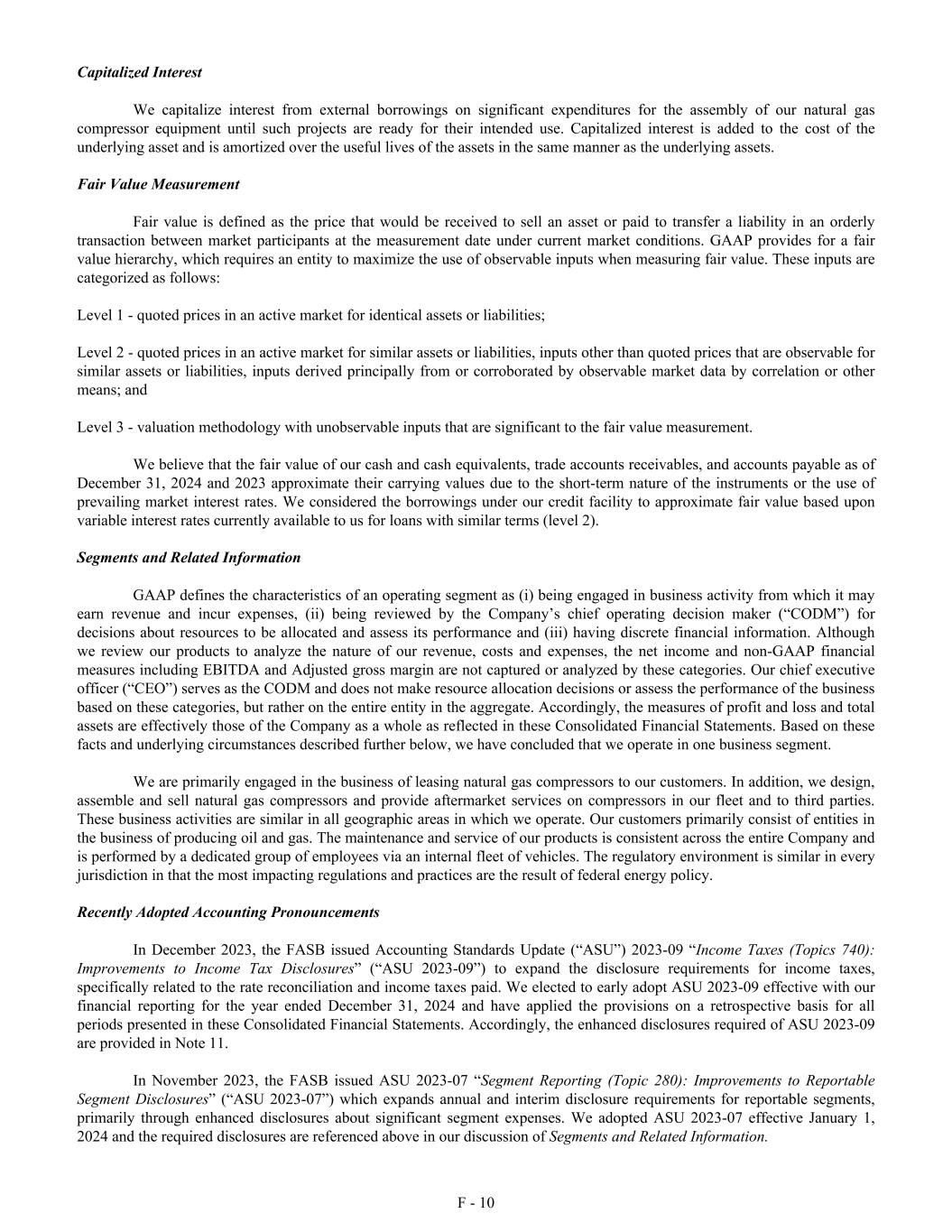 Capitalized Interest We capitalize interest from external borrowings on significant expenditures for the assembly of our natural gas compressor equipment until such projects are ready for their intended use. Capitalized interest is added to the cost of the underlying asset and is amortized over the useful lives of the assets in the same manner as the underlying assets. Fair Value Measurement Fair value is defined as the price that would be received to sell an asset or paid to transfer a liability in an orderly transaction between market participants at the measurement date under current market conditions. GAAP provides for a fair value hierarchy, which requires an entity to maximize the use of observable inputs when measuring fair value. These inputs are categorized as follows: Level 1 - quoted prices in an active market for identical assets or liabilities; Level 2 - quoted prices in an active market for similar assets or liabilities, inputs other than quoted prices that are observable for similar assets or liabilities, inputs derived principally from or corroborated by observable market data by correlation or other means; and Level 3 - valuation methodology with unobservable inputs that are significant to the fair value measurement. We believe that the fair value of our cash and cash equivalents, trade accounts receivables, and accounts payable as of December 31, 2024 and 2023 approximate their carrying values due to the short-term nature of the instruments or the use of prevailing market interest rates. We considered the borrowings under our credit facility to approximate fair value based upon variable interest rates currently available to us for loans with similar terms (level 2). Segments and Related Information GAAP defines the characteristics of an operating segment as (i) being engaged in business activity from which it may earn revenue and incur expenses, (ii) being reviewed by the Company’s chief operating decision maker (“CODM”) for decisions about resources to be allocated and assess its performance and (iii) having discrete financial information. Although we review our products to analyze the nature of our revenue, costs and expenses, the net income and non-GAAP financial measures including EBITDA and Adjusted gross margin are not captured or analyzed by these categories. Our chief executive officer (“CEO”) serves as the CODM and does not make resource allocation decisions or assess the performance of the business based on these categories, but rather on the entire entity in the aggregate. Accordingly, the measures of profit and loss and total assets are effectively those of the Company as a whole as reflected in these Consolidated Financial Statements. Based on these facts and underlying circumstances described further below, we have concluded that we operate in one business segment. We are primarily engaged in the business of leasing natural gas compressors to our customers. In addition, we design, assemble and sell natural gas compressors and provide aftermarket services on compressors in our fleet and to third parties. These business activities are similar in all geographic areas in which we operate. Our customers primarily consist of entities in the business of producing oil and gas. The maintenance and service of our products is consistent across the entire Company and is performed by a dedicated group of employees via an internal fleet of vehicles. The regulatory environment is similar in every jurisdiction in that the most impacting regulations and practices are the result of federal energy policy. Recently Adopted Accounting Pronouncements In December 2023, the FASB issued Accounting Standards Update (“ASU”) 2023-09 “Income Taxes (Topics 740): Improvements to Income Tax Disclosures” (“ASU 2023-09”) to expand the disclosure requirements for income taxes, specifically related to the rate reconciliation and income taxes paid. We elected to early adopt ASU 2023-09 effective with our financial reporting for the year ended December 31, 2024 and have applied the provisions on a retrospective basis for all periods presented in these Consolidated Financial Statements. Accordingly, the enhanced disclosures required of ASU 2023-09 are provided in Note 11. In November 2023, the FASB issued ASU 2023-07 “Segment Reporting (Topic 280): Improvements to Reportable Segment Disclosures” (“ASU 2023-07”) which expands annual and interim disclosure requirements for reportable segments, primarily through enhanced disclosures about significant segment expenses. We adopted ASU 2023-07 effective January 1, 2024 and the required disclosures are referenced above in our discussion of Segments and Related Information. F - 10