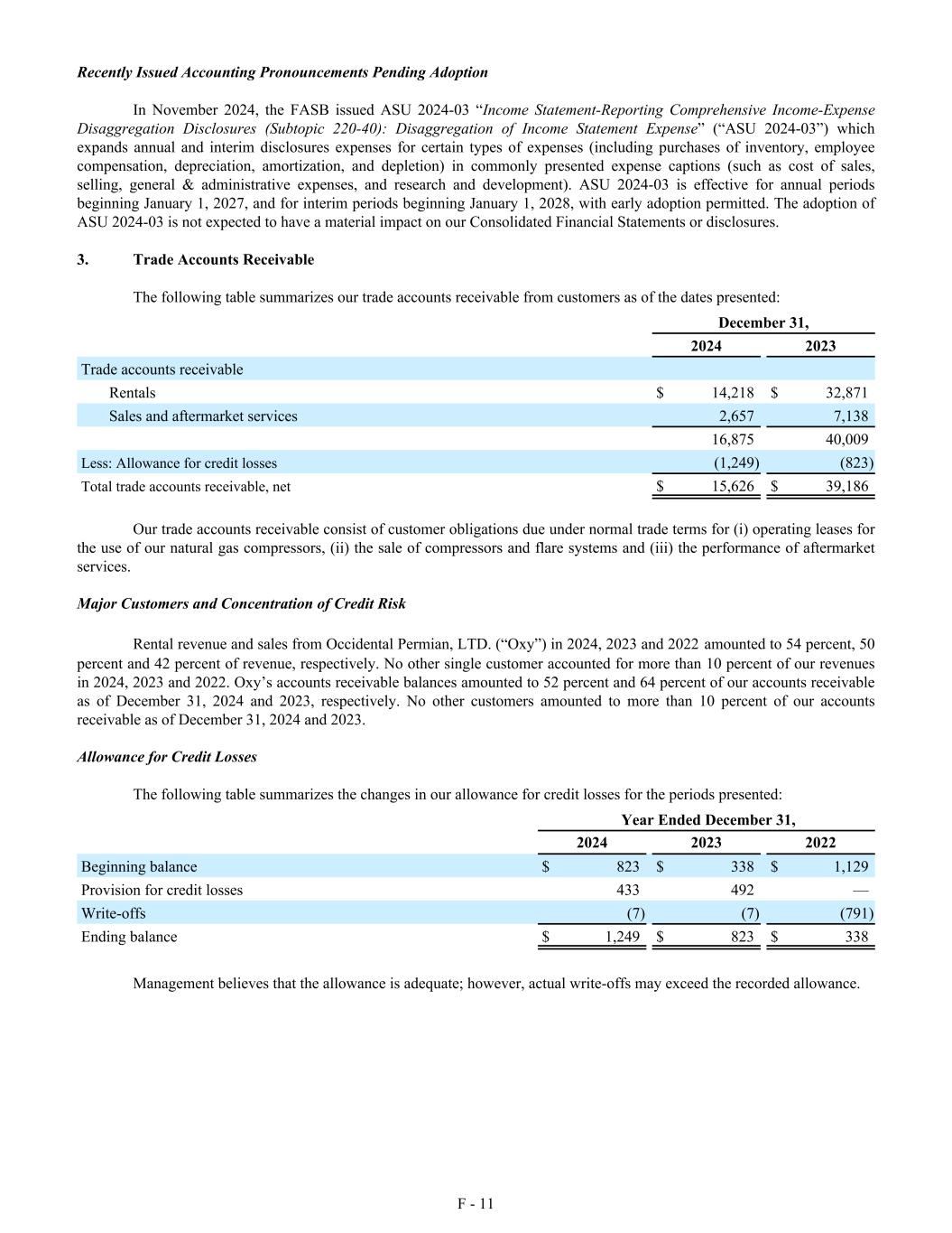 Recently Issued Accounting Pronouncements Pending Adoption In November 2024, the FASB issued ASU 2024-03 “Income Statement-Reporting Comprehensive Income-Expense Disaggregation Disclosures (Subtopic 220-40): Disaggregation of Income Statement Expense” (“ASU 2024-03”) which expands annual and interim disclosures expenses for certain types of expenses (including purchases of inventory, employee compensation, depreciation, amortization, and depletion) in commonly presented expense captions (such as cost of sales, selling, general & administrative expenses, and research and development). ASU 2024-03 is effective for annual periods beginning January 1, 2027, and for interim periods beginning January 1, 2028, with early adoption permitted. The adoption of ASU 2024-03 is not expected to have a material impact on our Consolidated Financial Statements or disclosures. 3. Trade Accounts Receivable The following table summarizes our trade accounts receivable from customers as of the dates presented: December 31, 2024 2023 Trade accounts receivable Rentals $ 14,218 $ 32,871 Sales and aftermarket services 2,657 7,138 16,875 40,009 Less: Allowance for credit losses (1,249) (823) Total trade accounts receivable, net $ 15,626 $ 39,186 Our trade accounts receivable consist of customer obligations due under normal trade terms for (i) operating leases for the use of our natural gas compressors, (ii) the sale of compressors and flare systems and (iii) the performance of aftermarket services. Major Customers and Concentration of Credit Risk Rental revenue and sales from Occidental Permian, LTD. (“Oxy”) in 2024, 2023 and 2022 amounted to 54 percent, 50 percent and 42 percent of revenue, respectively. No other single customer accounted for more than 10 percent of our revenues in 2024, 2023 and 2022. Oxy’s accounts receivable balances amounted to 52 percent and 64 percent of our accounts receivable as of December 31, 2024 and 2023, respectively. No other customers amounted to more than 10 percent of our accounts receivable as of December 31, 2024 and 2023. Allowance for Credit Losses The following table summarizes the changes in our allowance for credit losses for the periods presented: Year Ended December 31, 2024 2023 2022 Beginning balance $ 823 $ 338 $ 1,129 Provision for credit losses 433 492 — Write-offs (7) (7) (791) Ending balance $ 1,249 $ 823 $ 338 Management believes that the allowance is adequate; however, actual write-offs may exceed the recorded allowance. F - 11