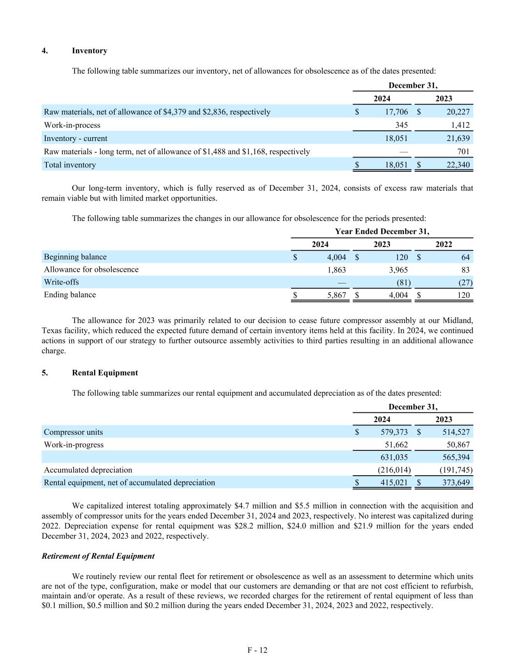 4. Inventory The following table summarizes our inventory, net of allowances for obsolescence as of the dates presented: December 31, 2024 2023 Raw materials, net of allowance of $4,379 and $2,836, respectively $ 17,706 $ 20,227 Work-in-process 345 1,412 Inventory - current 18,051 21,639 Raw materials - long term, net of allowance of $1,488 and $1,168, respectively — 701 Total inventory $ 18,051 $ 22,340 Our long-term inventory, which is fully reserved as of December 31, 2024, consists of excess raw materials that remain viable but with limited market opportunities. The following table summarizes the changes in our allowance for obsolescence for the periods presented: Year Ended December 31, 2024 2023 2022 Beginning balance $ 4,004 $ 120 $ 64 Allowance for obsolescence 1,863 3,965 83 Write-offs — (81) (27) Ending balance $ 5,867 $ 4,004 $ 120 The allowance for 2023 was primarily related to our decision to cease future compressor assembly at our Midland, Texas facility, which reduced the expected future demand of certain inventory items held at this facility. In 2024, we continued actions in support of our strategy to further outsource assembly activities to third parties resulting in an additional allowance charge. 5. Rental Equipment The following table summarizes our rental equipment and accumulated depreciation as of the dates presented: December 31, 2024 2023 Compressor units $ 579,373 $ 514,527 Work-in-progress 51,662 50,867 631,035 565,394 Accumulated depreciation (216,014) (191,745) Rental equipment, net of accumulated depreciation $ 415,021 $ 373,649 We capitalized interest totaling approximately $4.7 million and $5.5 million in connection with the acquisition and assembly of compressor units for the years ended December 31, 2024 and 2023, respectively. No interest was capitalized during 2022. Depreciation expense for rental equipment was $28.2 million, $24.0 million and $21.9 million for the years ended December 31, 2024, 2023 and 2022, respectively. Retirement of Rental Equipment We routinely review our rental fleet for retirement or obsolescence as well as an assessment to determine which units are not of the type, configuration, make or model that our customers are demanding or that are not cost efficient to refurbish, maintain and/or operate. As a result of these reviews, we recorded charges for the retirement of rental equipment of less than $0.1 million, $0.5 million and $0.2 million during the years ended December 31, 2024, 2023 and 2022, respectively. F - 12