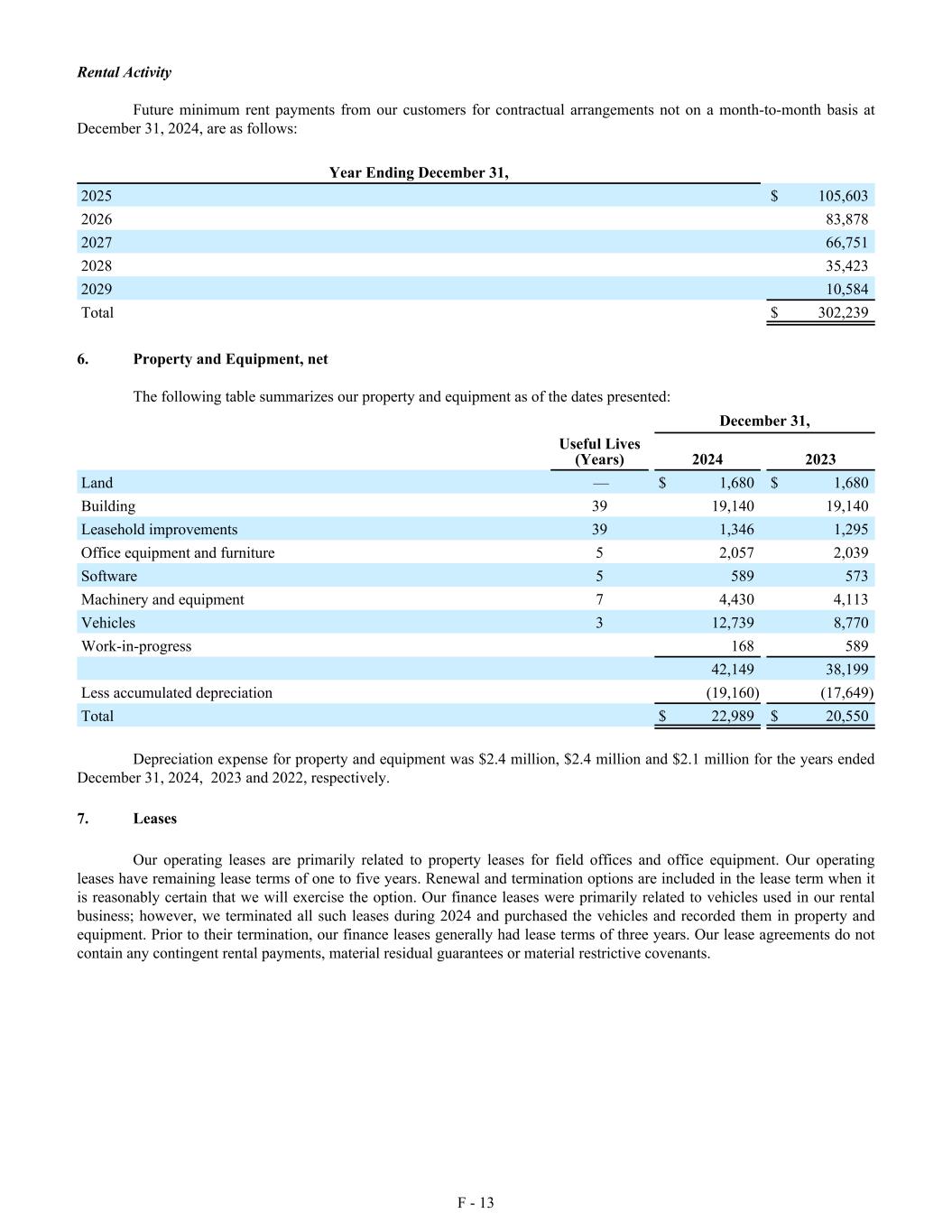 Rental Activity Future minimum rent payments from our customers for contractual arrangements not on a month-to-month basis at December 31, 2024, are as follows: Year Ending December 31, 2025 $ 105,603 2026 83,878 2027 66,751 2028 35,423 2029 10,584 Total $ 302,239 6. Property and Equipment, net The following table summarizes our property and equipment as of the dates presented: December 31, Useful Lives (Years) 2024 2023 Land — $ 1,680 $ 1,680 Building 39 19,140 19,140 Leasehold improvements 39 1,346 1,295 Office equipment and furniture 5 2,057 2,039 Software 5 589 573 Machinery and equipment 7 4,430 4,113 Vehicles 3 12,739 8,770 Work-in-progress 168 589 42,149 38,199 Less accumulated depreciation (19,160) (17,649) Total $ 22,989 $ 20,550 Depreciation expense for property and equipment was $2.4 million, $2.4 million and $2.1 million for the years ended December 31, 2024, 2023 and 2022, respectively. 7. Leases Our operating leases are primarily related to property leases for field offices and office equipment. Our operating leases have remaining lease terms of one to five years. Renewal and termination options are included in the lease term when it is reasonably certain that we will exercise the option. Our finance leases were primarily related to vehicles used in our rental business; however, we terminated all such leases during 2024 and purchased the vehicles and recorded them in property and equipment. Prior to their termination, our finance leases generally had lease terms of three years. Our lease agreements do not contain any contingent rental payments, material residual guarantees or material restrictive covenants. F - 13
