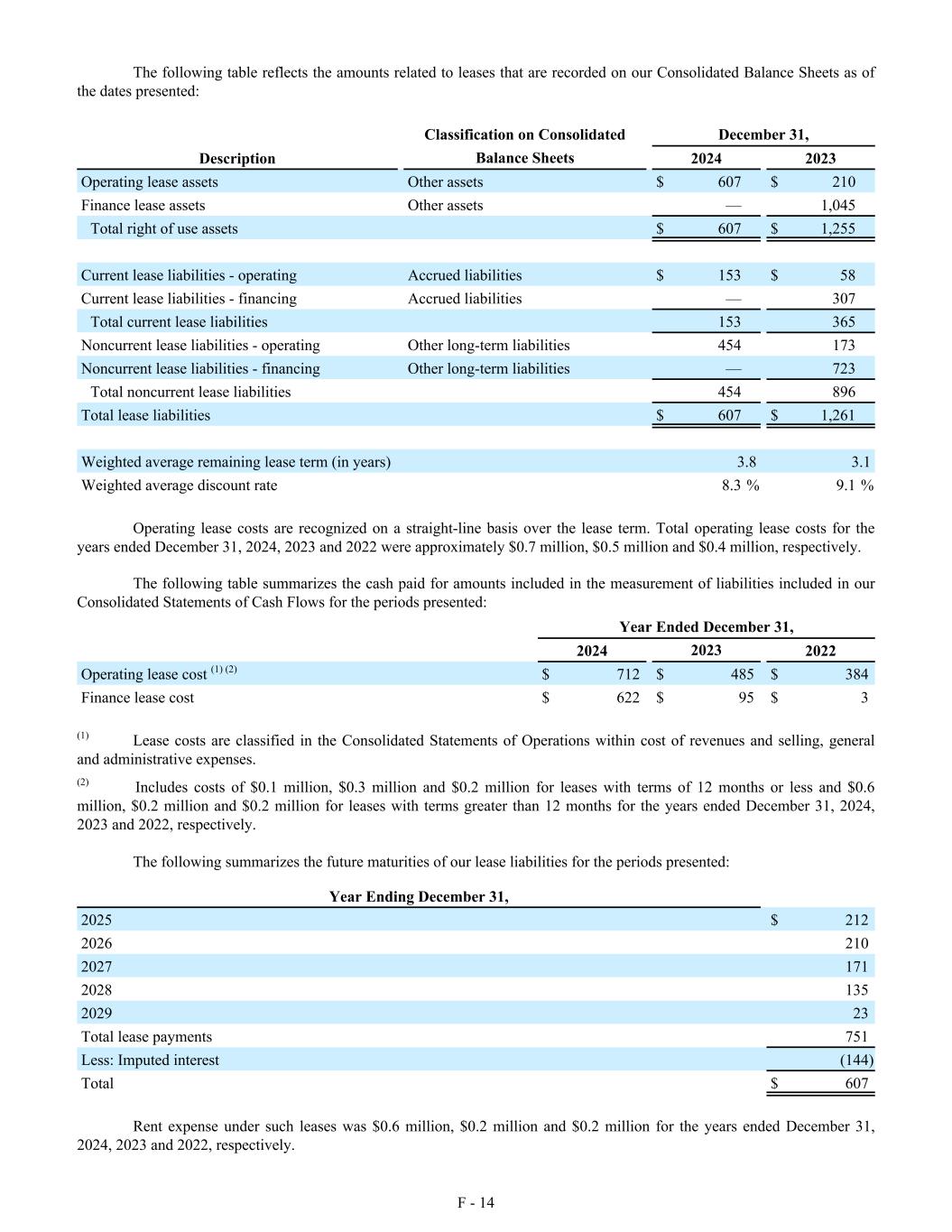 The following table reflects the amounts related to leases that are recorded on our Consolidated Balance Sheets as of the dates presented: Classification on Consolidated December 31, Description Balance Sheets 2024 2023 Operating lease assets Other assets $ 607 $ 210 Finance lease assets Other assets — 1,045 Total right of use assets $ 607 $ 1,255 Current lease liabilities - operating Accrued liabilities $ 153 $ 58 Current lease liabilities - financing Accrued liabilities — 307 Total current lease liabilities 153 365 Noncurrent lease liabilities - operating Other long-term liabilities 454 173 Noncurrent lease liabilities - financing Other long-term liabilities — 723 Total noncurrent lease liabilities 454 896 Total lease liabilities $ 607 $ 1,261 Weighted average remaining lease term (in years) 3.8 3.1 Weighted average discount rate 8.3 % 9.1 % Operating lease costs are recognized on a straight-line basis over the lease term. Total operating lease costs for the years ended December 31, 2024, 2023 and 2022 were approximately $0.7 million, $0.5 million and $0.4 million, respectively. The following table summarizes the cash paid for amounts included in the measurement of liabilities included in our Consolidated Statements of Cash Flows for the periods presented: Year Ended December 31, 2024 2023 2022 Operating lease cost (1) (2) $ 712 $ 485 $ 384 Finance lease cost $ 622 $ 95 $ 3 (1) Lease costs are classified in the Consolidated Statements of Operations within cost of revenues and selling, general and administrative expenses. (2) Includes costs of $0.1 million, $0.3 million and $0.2 million for leases with terms of 12 months or less and $0.6 million, $0.2 million and $0.2 million for leases with terms greater than 12 months for the years ended December 31, 2024, 2023 and 2022, respectively. The following summarizes the future maturities of our lease liabilities for the periods presented: Year Ending December 31, 2025 $ 212 2026 210 2027 171 2028 135 2029 23 Total lease payments 751 Less: Imputed interest (144) Total $ 607 Rent expense under such leases was $0.6 million, $0.2 million and $0.2 million for the years ended December 31, 2024, 2023 and 2022, respectively. F - 14