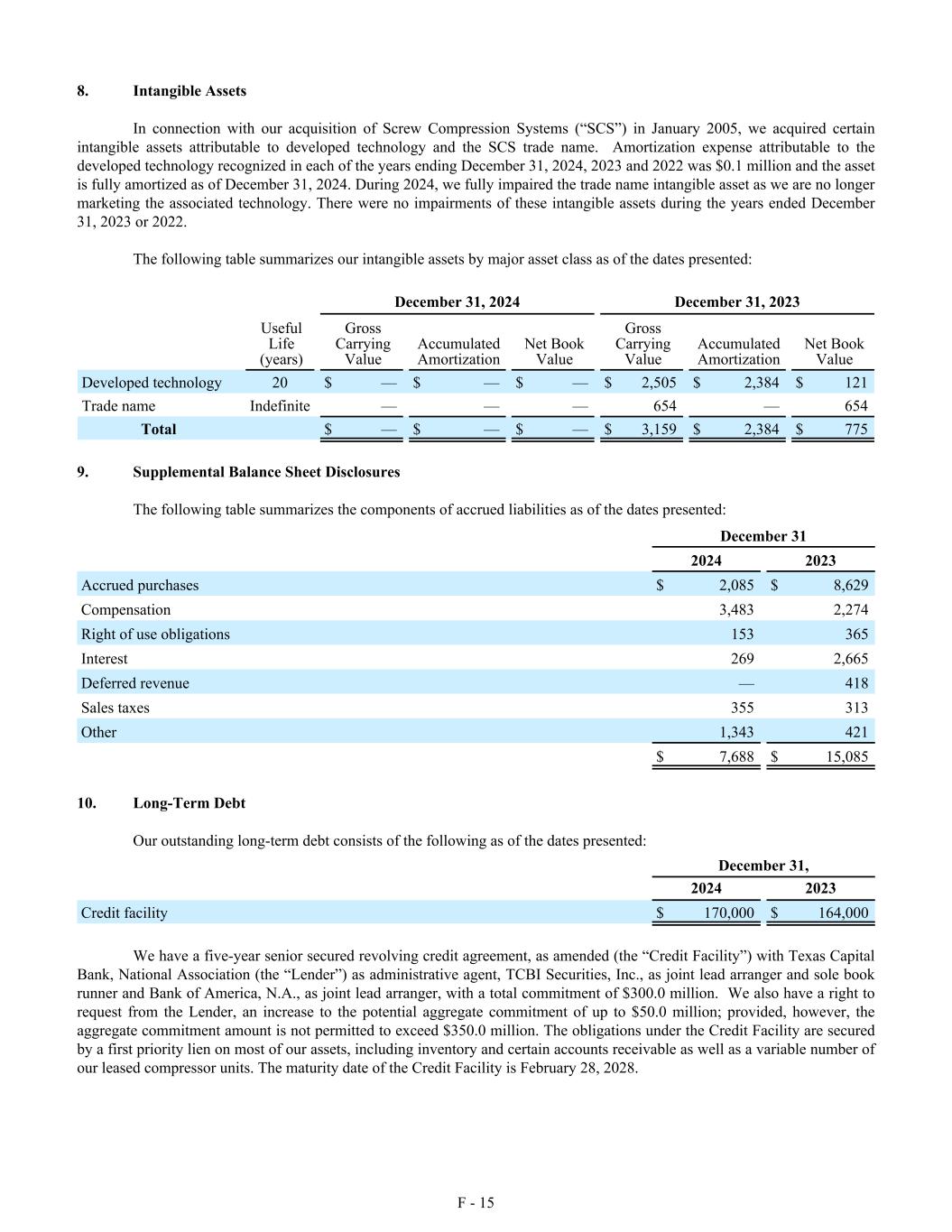 8. Intangible Assets In connection with our acquisition of Screw Compression Systems (“SCS”) in January 2005, we acquired certain intangible assets attributable to developed technology and the SCS trade name. Amortization expense attributable to the developed technology recognized in each of the years ending December 31, 2024, 2023 and 2022 was $0.1 million and the asset is fully amortized as of December 31, 2024. During 2024, we fully impaired the trade name intangible asset as we are no longer marketing the associated technology. There were no impairments of these intangible assets during the years ended December 31, 2023 or 2022. The following table summarizes our intangible assets by major asset class as of the dates presented: December 31, 2024 December 31, 2023 Useful Life (years) Gross Carrying Value Accumulated Amortization Net Book Value Gross Carrying Value Accumulated Amortization Net Book Value Developed technology 20 $ — $ — $ — $ 2,505 $ 2,384 $ 121 Trade name Indefinite — — — 654 — 654 Total $ — $ — $ — $ 3,159 $ 2,384 $ 775 9. Supplemental Balance Sheet Disclosures The following table summarizes the components of accrued liabilities as of the dates presented: December 31 2024 2023 Accrued purchases $ 2,085 $ 8,629 Compensation 3,483 2,274 Right of use obligations 153 365 Interest 269 2,665 Deferred revenue — 418 Sales taxes 355 313 Other 1,343 421 $ 7,688 $ 15,085 10. Long-Term Debt Our outstanding long-term debt consists of the following as of the dates presented: December 31, 2024 2023 Credit facility $ 170,000 $ 164,000 We have a five-year senior secured revolving credit agreement, as amended (the “Credit Facility”) with Texas Capital Bank, National Association (the “Lender”) as administrative agent, TCBI Securities, Inc., as joint lead arranger and sole book runner and Bank of America, N.A., as joint lead arranger, with a total commitment of $300.0 million. We also have a right to request from the Lender, an increase to the potential aggregate commitment of up to $50.0 million; provided, however, the aggregate commitment amount is not permitted to exceed $350.0 million. The obligations under the Credit Facility are secured by a first priority lien on most of our assets, including inventory and certain accounts receivable as well as a variable number of our leased compressor units. The maturity date of the Credit Facility is February 28, 2028. F - 15