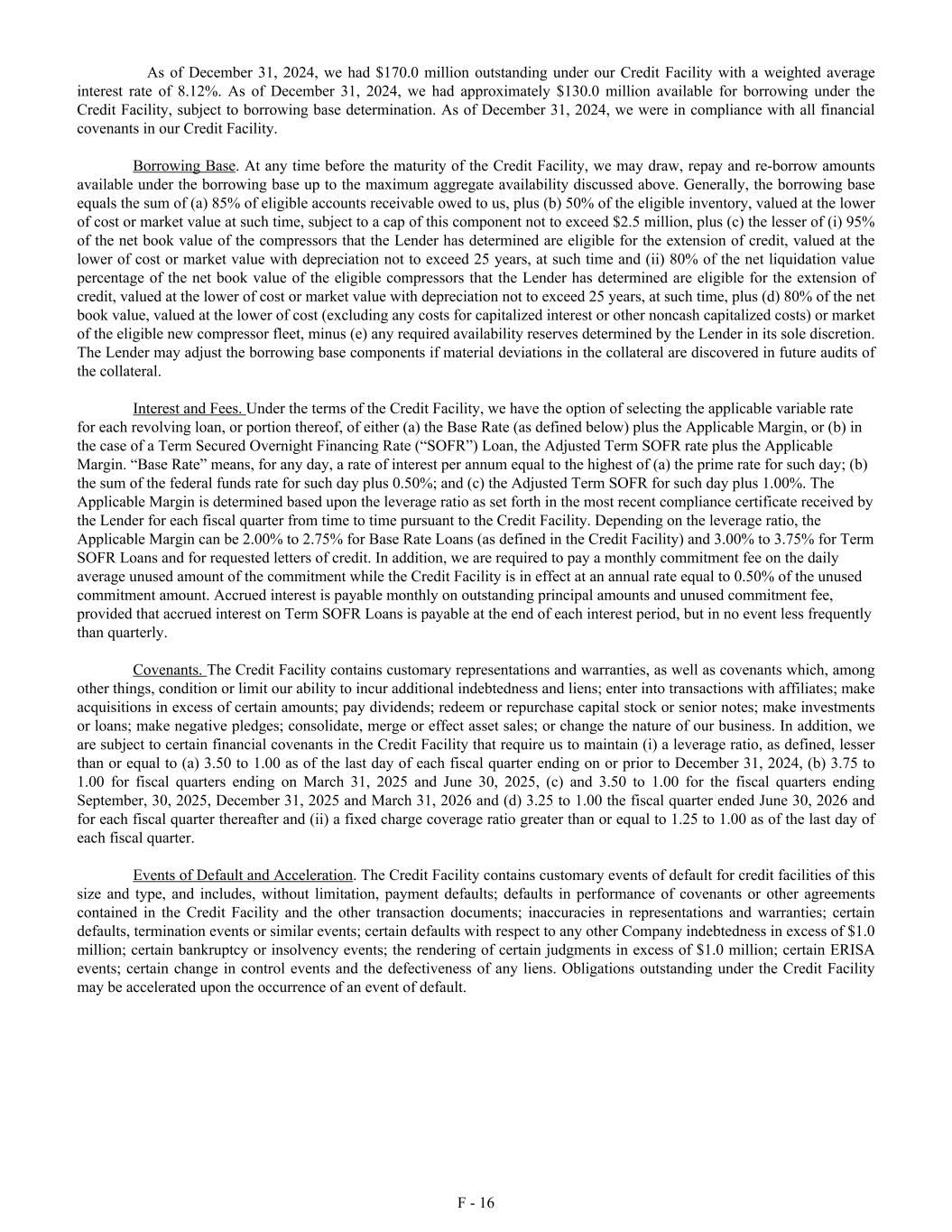 As of December 31, 2024, we had $170.0 million outstanding under our Credit Facility with a weighted average interest rate of 8.12%. As of December 31, 2024, we had approximately $130.0 million available for borrowing under the Credit Facility, subject to borrowing base determination. As of December 31, 2024, we were in compliance with all financial covenants in our Credit Facility. Borrowing Base. At any time before the maturity of the Credit Facility, we may draw, repay and re-borrow amounts available under the borrowing base up to the maximum aggregate availability discussed above. Generally, the borrowing base equals the sum of (a) 85% of eligible accounts receivable owed to us, plus (b) 50% of the eligible inventory, valued at the lower of cost or market value at such time, subject to a cap of this component not to exceed $2.5 million, plus (c) the lesser of (i) 95% of the net book value of the compressors that the Lender has determined are eligible for the extension of credit, valued at the lower of cost or market value with depreciation not to exceed 25 years, at such time and (ii) 80% of the net liquidation value percentage of the net book value of the eligible compressors that the Lender has determined are eligible for the extension of credit, valued at the lower of cost or market value with depreciation not to exceed 25 years, at such time, plus (d) 80% of the net book value, valued at the lower of cost (excluding any costs for capitalized interest or other noncash capitalized costs) or market of the eligible new compressor fleet, minus (e) any required availability reserves determined by the Lender in its sole discretion. The Lender may adjust the borrowing base components if material deviations in the collateral are discovered in future audits of the collateral. Interest and Fees. Under the terms of the Credit Facility, we have the option of selecting the applicable variable rate for each revolving loan, or portion thereof, of either (a) the Base Rate (as defined below) plus the Applicable Margin, or (b) in the case of a Term Secured Overnight Financing Rate (“SOFR”) Loan, the Adjusted Term SOFR rate plus the Applicable Margin. “Base Rate” means, for any day, a rate of interest per annum equal to the highest of (a) the prime rate for such day; (b) the sum of the federal funds rate for such day plus 0.50%; and (c) the Adjusted Term SOFR for such day plus 1.00%. The Applicable Margin is determined based upon the leverage ratio as set forth in the most recent compliance certificate received by the Lender for each fiscal quarter from time to time pursuant to the Credit Facility. Depending on the leverage ratio, the Applicable Margin can be 2.00% to 2.75% for Base Rate Loans (as defined in the Credit Facility) and 3.00% to 3.75% for Term SOFR Loans and for requested letters of credit. In addition, we are required to pay a monthly commitment fee on the daily average unused amount of the commitment while the Credit Facility is in effect at an annual rate equal to 0.50% of the unused commitment amount. Accrued interest is payable monthly on outstanding principal amounts and unused commitment fee, provided that accrued interest on Term SOFR Loans is payable at the end of each interest period, but in no event less frequently than quarterly. Covenants. The Credit Facility contains customary representations and warranties, as well as covenants which, among other things, condition or limit our ability to incur additional indebtedness and liens; enter into transactions with affiliates; make acquisitions in excess of certain amounts; pay dividends; redeem or repurchase capital stock or senior notes; make investments or loans; make negative pledges; consolidate, merge or effect asset sales; or change the nature of our business. In addition, we are subject to certain financial covenants in the Credit Facility that require us to maintain (i) a leverage ratio, as defined, lesser than or equal to (a) 3.50 to 1.00 as of the last day of each fiscal quarter ending on or prior to December 31, 2024, (b) 3.75 to 1.00 for fiscal quarters ending on March 31, 2025 and June 30, 2025, (c) and 3.50 to 1.00 for the fiscal quarters ending September, 30, 2025, December 31, 2025 and March 31, 2026 and (d) 3.25 to 1.00 the fiscal quarter ended June 30, 2026 and for each fiscal quarter thereafter and (ii) a fixed charge coverage ratio greater than or equal to 1.25 to 1.00 as of the last day of each fiscal quarter. Events of Default and Acceleration. The Credit Facility contains customary events of default for credit facilities of this size and type, and includes, without limitation, payment defaults; defaults in performance of covenants or other agreements contained in the Credit Facility and the other transaction documents; inaccuracies in representations and warranties; certain defaults, termination events or similar events; certain defaults with respect to any other Company indebtedness in excess of $1.0 million; certain bankruptcy or insolvency events; the rendering of certain judgments in excess of $1.0 million; certain ERISA events; certain change in control events and the defectiveness of any liens. Obligations outstanding under the Credit Facility may be accelerated upon the occurrence of an event of default. F - 16