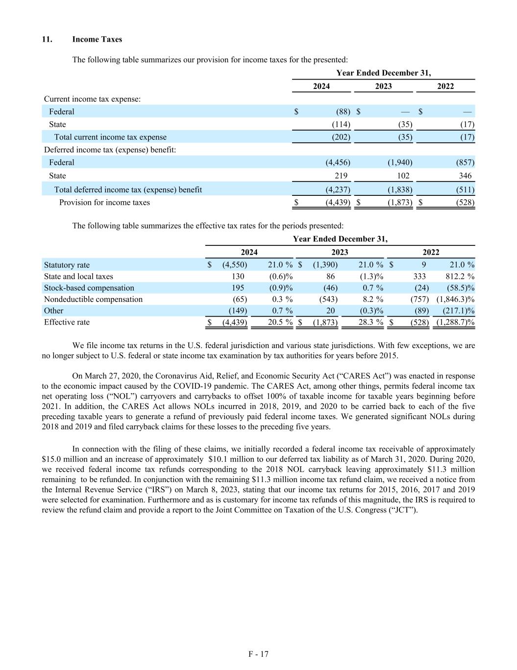 11. Income Taxes The following table summarizes our provision for income taxes for the presented: Year Ended December 31, 2024 2023 2022 Current income tax expense: Federal $ (88) $ — $ — State (114) (35) (17) Total current income tax expense (202) (35) (17) Deferred income tax (expense) benefit: Federal (4,456) (1,940) (857) State 219 102 346 Total deferred income tax (expense) benefit (4,237) (1,838) (511) Provision for income taxes $ (4,439) $ (1,873) $ (528) The following table summarizes the effective tax rates for the periods presented: Year Ended December 31, 2024 2023 2022 Statutory rate $ (4,550) 21.0 % $ (1,390) 21.0 % $ 9 21.0 % State and local taxes 130 (0.6) % 86 (1.3) % 333 812.2 % Stock-based compensation 195 (0.9) % (46) 0.7 % (24) (58.5) % Nondeductible compensation (65) 0.3 % (543) 8.2 % (757) (1,846.3) % Other (149) 0.7 % 20 (0.3) % (89) (217.1) % Effective rate $ (4,439) 20.5 % $ (1,873) 28.3 % $ (528) (1,288.7) % We file income tax returns in the U.S. federal jurisdiction and various state jurisdictions. With few exceptions, we are no longer subject to U.S. federal or state income tax examination by tax authorities for years before 2015. On March 27, 2020, the Coronavirus Aid, Relief, and Economic Security Act (“CARES Act”) was enacted in response to the economic impact caused by the COVID-19 pandemic. The CARES Act, among other things, permits federal income tax net operating loss (“NOL”) carryovers and carrybacks to offset 100% of taxable income for taxable years beginning before 2021. In addition, the CARES Act allows NOLs incurred in 2018, 2019, and 2020 to be carried back to each of the five preceding taxable years to generate a refund of previously paid federal income taxes. We generated significant NOLs during 2018 and 2019 and filed carryback claims for these losses to the preceding five years. In connection with the filing of these claims, we initially recorded a federal income tax receivable of approximately $15.0 million and an increase of approximately $10.1 million to our deferred tax liability as of March 31, 2020. During 2020, we received federal income tax refunds corresponding to the 2018 NOL carryback leaving approximately $11.3 million remaining to be refunded. In conjunction with the remaining $11.3 million income tax refund claim, we received a notice from the Internal Revenue Service (“IRS”) on March 8, 2023, stating that our income tax returns for 2015, 2016, 2017 and 2019 were selected for examination. Furthermore and as is customary for income tax refunds of this magnitude, the IRS is required to review the refund claim and provide a report to the Joint Committee on Taxation of the U.S. Congress (“JCT”). F - 17