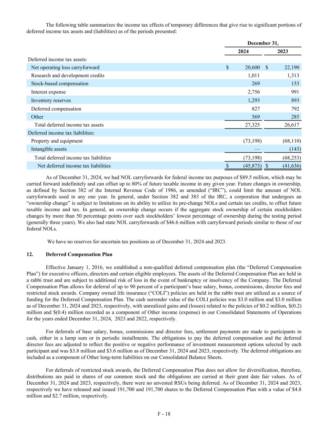 The following table summarizes the income tax effects of temporary differences that give rise to significant portions of deferred income tax assets and (liabilities) as of the periods presented: December 31, 2024 2023 Deferred income tax assets: Net operating loss carryforward $ 20,600 $ 22,190 Research and development credits 1,011 1,313 Stock-based compensation 269 153 Interest expense 2,756 991 Inventory reserves 1,293 893 Deferred compensation 827 792 Other 569 285 Total deferred income tax assets 27,325 26,617 Deferred income tax liabilities: Property and equipment (73,198) (68,110) Intangible assets — (143) Total deferred income tax liabilities (73,198) (68,253) Net deferred income tax liabilities $ (45,873) $ (41,636) As of December 31, 2024, we had NOL carryforwards for federal income tax purposes of $89.5 million, which may be carried forward indefinitely and can offset up to 80% of future taxable income in any given year. Future changes in ownership, as defined by Section 382 of the Internal Revenue Code of 1986, as amended (“IRC”), could limit the amount of NOL carryforwards used in any one year. In general, under Section 382 and 383 of the IRC, a corporation that undergoes an “ownership change” is subject to limitations on its ability to utilize its pre-change NOLs and certain tax credits, to offset future taxable income and tax. In general, an ownership change occurs if the aggregate stock ownership of certain stockholders changes by more than 50 percentage points over such stockholders’ lowest percentage of ownership during the testing period (generally three years). We also had state NOL carryforwards of $46.6 million with carryforward periods similar to those of our federal NOLs. We have no reserves for uncertain tax positions as of December 31, 2024 and 2023. 12. Deferred Compensation Plan Effective January 1, 2016, we established a non-qualified deferred compensation plan (the “Deferred Compensation Plan”) for executive officers, directors and certain eligible employees. The assets of the Deferred Compensation Plan are held in a rabbi trust and are subject to additional risk of loss in the event of bankruptcy or insolvency of the Company. The Deferred Compensation Plan allows for deferral of up to 90 percent of a participant’s base salary, bonus, commissions, director fees and restricted stock awards. Company owned life insurance (“COLI”) policies are held in the rabbi trust are utilized as a source of funding for the Deferred Compensation Plan. The cash surrender value of the COLI policies was $3.0 million and $3.0 million as of December 31, 2024 and 2023, respectively, with unrealized gains and (losses) related to the policies of $0.2 million, $(0.2) million and $(0.4) million recorded as a component of Other income (expense) in our Consolidated Statements of Operations for the years ended December 31, 2024, 2023 and 2022, respectively. For deferrals of base salary, bonus, commissions and director fees, settlement payments are made to participants in cash, either in a lump sum or in periodic installments. The obligations to pay the deferred compensation and the deferred director fees are adjusted to reflect the positive or negative performance of investment measurement options selected by each participant and was $3.8 million and $3.6 million as of December 31, 2024 and 2023, respectively. The deferred obligations are included as a component of Other long-term liabilities on our Consolidated Balance Sheets. For deferrals of restricted stock awards, the Deferred Compensation Plan does not allow for diversification, therefore, distributions are paid in shares of our common stock and the obligations are carried at their grant date fair values. As of December 31, 2024 and 2023, respectively, there were no unvested RSUs being deferred. As of December 31, 2024 and 2023, respectively we have released and issued 191,700 and 191,700 shares to the Deferred Compensation Plan with a value of $4.8 million and $2.7 million, respectively. F - 18