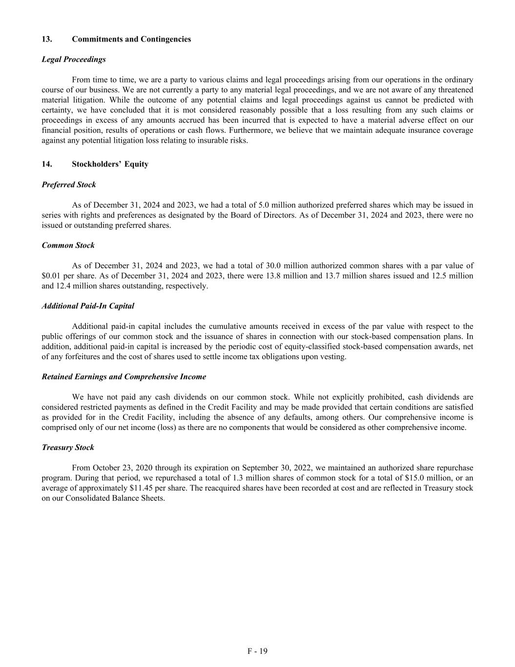 13. Commitments and Contingencies Legal Proceedings From time to time, we are a party to various claims and legal proceedings arising from our operations in the ordinary course of our business. We are not currently a party to any material legal proceedings, and we are not aware of any threatened material litigation. While the outcome of any potential claims and legal proceedings against us cannot be predicted with certainty, we have concluded that it is mot considered reasonably possible that a loss resulting from any such claims or proceedings in excess of any amounts accrued has been incurred that is expected to have a material adverse effect on our financial position, results of operations or cash flows. Furthermore, we believe that we maintain adequate insurance coverage against any potential litigation loss relating to insurable risks. 14. Stockholders’ Equity Preferred Stock As of December 31, 2024 and 2023, we had a total of 5.0 million authorized preferred shares which may be issued in series with rights and preferences as designated by the Board of Directors. As of December 31, 2024 and 2023, there were no issued or outstanding preferred shares. Common Stock As of December 31, 2024 and 2023, we had a total of 30.0 million authorized common shares with a par value of $0.01 per share. As of December 31, 2024 and 2023, there were 13.8 million and 13.7 million shares issued and 12.5 million and 12.4 million shares outstanding, respectively. Additional Paid-In Capital Additional paid-in capital includes the cumulative amounts received in excess of the par value with respect to the public offerings of our common stock and the issuance of shares in connection with our stock-based compensation plans. In addition, additional paid-in capital is increased by the periodic cost of equity-classified stock-based compensation awards, net of any forfeitures and the cost of shares used to settle income tax obligations upon vesting. Retained Earnings and Comprehensive Income We have not paid any cash dividends on our common stock. While not explicitly prohibited, cash dividends are considered restricted payments as defined in the Credit Facility and may be made provided that certain conditions are satisfied as provided for in the Credit Facility, including the absence of any defaults, among others. Our comprehensive income is comprised only of our net income (loss) as there are no components that would be considered as other comprehensive income. Treasury Stock From October 23, 2020 through its expiration on September 30, 2022, we maintained an authorized share repurchase program. During that period, we repurchased a total of 1.3 million shares of common stock for a total of $15.0 million, or an average of approximately $11.45 per share. The reacquired shares have been recorded at cost and are reflected in Treasury stock on our Consolidated Balance Sheets. F - 19