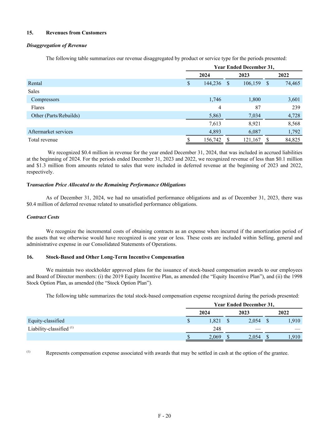 15. Revenues from Customers Disaggregation of Revenue The following table summarizes our revenue disaggregated by product or service type for the periods presented: Year Ended December 31, 2024 2023 2022 Rental $ 144,236 $ 106,159 $ 74,465 Sales Compressors 1,746 1,800 3,601 Flares 4 87 239 Other (Parts/Rebuilds) 5,863 7,034 4,728 7,613 8,921 8,568 Aftermarket services 4,893 6,087 1,792 Total revenue $ 156,742 $ 121,167 $ 84,825 We recognized $0.4 million in revenue for the year ended December 31, 2024, that was included in accrued liabilities at the beginning of 2024. For the periods ended December 31, 2023 and 2022, we recognized revenue of less than $0.1 million and $1.3 million from amounts related to sales that were included in deferred revenue at the beginning of 2023 and 2022, respectively. Transaction Price Allocated to the Remaining Performance Obligations As of December 31, 2024, we had no unsatisfied performance obligations and as of December 31, 2023, there was $0.4 million of deferred revenue related to unsatisfied performance obligations. Contract Costs We recognize the incremental costs of obtaining contracts as an expense when incurred if the amortization period of the assets that we otherwise would have recognized is one year or less. These costs are included within Selling, general and administrative expense in our Consolidated Statements of Operations. 16. Stock-Based and Other Long-Term Incentive Compensation We maintain two stockholder approved plans for the issuance of stock-based compensation awards to our employees and Board of Director members: (i) the 2019 Equity Incentive Plan, as amended (the “Equity Incentive Plan”), and (ii) the 1998 Stock Option Plan, as amended (the “Stock Option Plan”). The following table summarizes the total stock-based compensation expense recognized during the periods presented: Year Ended December 31, 2024 2023 2022 Equity-classified $ 1,821 $ 2,054 $ 1,910 Liability-classified (1) 248 — — $ 2,069 $ 2,054 $ 1,910 (1) Represents compensation expense associated with awards that may be settled in cash at the option of the grantee. F - 20