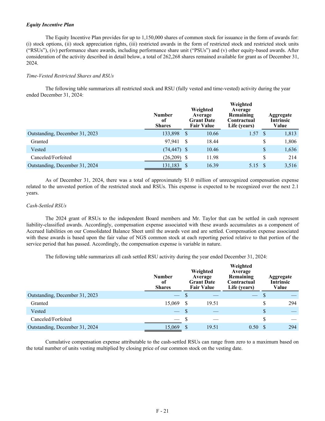 Equity Incentive Plan The Equity Incentive Plan provides for up to 1,150,000 shares of common stock for issuance in the form of awards for: (i) stock options, (ii) stock appreciation rights, (iii) restricted awards in the form of restricted stock and restricted stock units (“RSUs”), (iv) performance share awards, including performance share unit (“PSUs”) and (v) other equity-based awards. After consideration of the activity described in detail below, a total of 262,268 shares remained available for grant as of December 31, 2024. Time-Vested Restricted Shares and RSUs The following table summarizes all restricted stock and RSU (fully vested and time-vested) activity during the year ended December 31, 2024: Number of Shares Weighted Average Grant Date Fair Value Weighted Average Remaining Contractual Life (years) Aggregate Intrinsic Value Outstanding, December 31, 2023 133,898 $ 10.66 1.57 $ 1,813 Granted 97,941 $ 18.44 $ 1,806 Vested (74,447) $ 10.46 $ 1,636 Canceled/Forfeited (26,209) $ 11.98 $ 214 Outstanding, December 31, 2024 131,183 $ 16.39 5.15 $ 3,516 As of December 31, 2024, there was a total of approximately $1.0 million of unrecognized compensation expense related to the unvested portion of the restricted stock and RSUs. This expense is expected to be recognized over the next 2.1 years. Cash-Settled RSUs The 2024 grant of RSUs to the independent Board members and Mr. Taylor that can be settled in cash represent liability-classified awards. Accordingly, compensation expense associated with these awards accumulates as a component of Accrued liabilities on our Consolidated Balance Sheet until the awards vest and are settled. Compensation expense associated with these awards is based upon the fair value of NGS common stock at each reporting period relative to that portion of the service period that has passed. Accordingly, the compensation expense is variable in nature. The following table summarizes all cash settled RSU activity during the year ended December 31, 2024: Number of Shares Weighted Average Grant Date Fair Value Weighted Average Remaining Contractual Life (years) Aggregate Intrinsic Value Outstanding, December 31, 2023 — $ — — $ — Granted 15,069 $ 19.51 $ 294 Vested — $ — $ — Canceled/Forfeited — $ — $ — Outstanding, December 31, 2024 15,069 $ 19.51 0.50 $ 294 Cumulative compensation expense attributable to the cash-settled RSUs can range from zero to a maximum based on the total number of units vesting multiplied by closing price of our common stock on the vesting date. F - 21