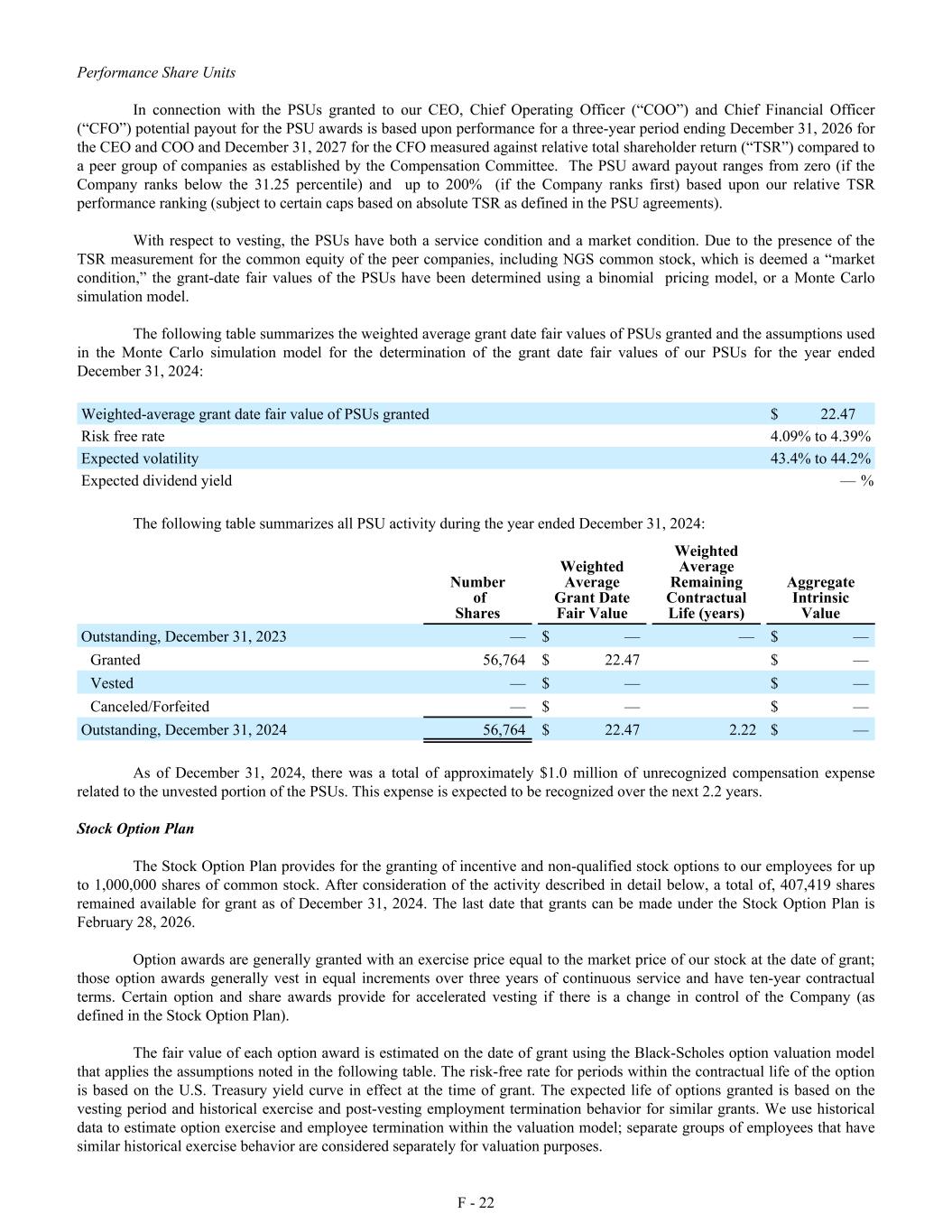Performance Share Units In connection with the PSUs granted to our CEO, Chief Operating Officer (“COO”) and Chief Financial Officer (“CFO”) potential payout for the PSU awards is based upon performance for a three-year period ending December 31, 2026 for the CEO and COO and December 31, 2027 for the CFO measured against relative total shareholder return (“TSR”) compared to a peer group of companies as established by the Compensation Committee. The PSU award payout ranges from zero (if the Company ranks below the 31.25 percentile) and up to 200% (if the Company ranks first) based upon our relative TSR performance ranking (subject to certain caps based on absolute TSR as defined in the PSU agreements). With respect to vesting, the PSUs have both a service condition and a market condition. Due to the presence of the TSR measurement for the common equity of the peer companies, including NGS common stock, which is deemed a “market condition,” the grant-date fair values of the PSUs have been determined using a binomial pricing model, or a Monte Carlo simulation model. The following table summarizes the weighted average grant date fair values of PSUs granted and the assumptions used in the Monte Carlo simulation model for the determination of the grant date fair values of our PSUs for the year ended December 31, 2024: Weighted-average grant date fair value of PSUs granted $ 22.47 Risk free rate 4.09% to 4.39% Expected volatility 43.4% to 44.2% Expected dividend yield — % The following table summarizes all PSU activity during the year ended December 31, 2024: Number of Shares Weighted Average Grant Date Fair Value Weighted Average Remaining Contractual Life (years) Aggregate Intrinsic Value Outstanding, December 31, 2023 — $ — — $ — Granted 56,764 $ 22.47 $ — Vested — $ — $ — Canceled/Forfeited — $ — $ — Outstanding, December 31, 2024 56,764 $ 22.47 2.22 $ — As of December 31, 2024, there was a total of approximately $1.0 million of unrecognized compensation expense related to the unvested portion of the PSUs. This expense is expected to be recognized over the next 2.2 years. Stock Option Plan The Stock Option Plan provides for the granting of incentive and non-qualified stock options to our employees for up to 1,000,000 shares of common stock. After consideration of the activity described in detail below, a total of, 407,419 shares remained available for grant as of December 31, 2024. The last date that grants can be made under the Stock Option Plan is February 28, 2026. Option awards are generally granted with an exercise price equal to the market price of our stock at the date of grant; those option awards generally vest in equal increments over three years of continuous service and have ten-year contractual terms. Certain option and share awards provide for accelerated vesting if there is a change in control of the Company (as defined in the Stock Option Plan). The fair value of each option award is estimated on the date of grant using the Black-Scholes option valuation model that applies the assumptions noted in the following table. The risk-free rate for periods within the contractual life of the option is based on the U.S. Treasury yield curve in effect at the time of grant. The expected life of options granted is based on the vesting period and historical exercise and post-vesting employment termination behavior for similar grants. We use historical data to estimate option exercise and employee termination within the valuation model; separate groups of employees that have similar historical exercise behavior are considered separately for valuation purposes. F - 22
