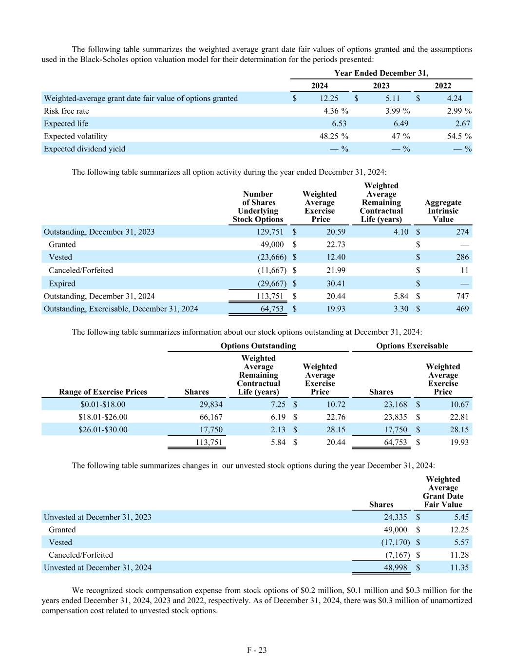 The following table summarizes the weighted average grant date fair values of options granted and the assumptions used in the Black-Scholes option valuation model for their determination for the periods presented: Year Ended December 31, 2024 2023 2022 Weighted-average grant date fair value of options granted $ 12.25 $ 5.11 $ 4.24 Risk free rate 4.36 % 3.99 % 2.99 % Expected life 6.53 6.49 2.67 Expected volatility 48.25 % 47 % 54.5 % Expected dividend yield — % — % — % The following table summarizes all option activity during the year ended December 31, 2024: Number of Shares Underlying Stock Options Weighted Average Exercise Price Weighted Average Remaining Contractual Life (years) Aggregate Intrinsic Value Outstanding, December 31, 2023 129,751 $ 20.59 4.10 $ 274 Granted 49,000 $ 22.73 $ — Vested (23,666) $ 12.40 $ 286 Canceled/Forfeited (11,667) $ 21.99 $ 11 Expired (29,667) $ 30.41 $ — Outstanding, December 31, 2024 113,751 $ 20.44 5.84 $ 747 Outstanding, Exercisable, December 31, 2024 64,753 $ 19.93 3.30 $ 469 The following table summarizes information about our stock options outstanding at December 31, 2024: Range of Exercise Prices Options Outstanding Options Exercisable Shares Weighted Average Remaining Contractual Life (years) Weighted Average Exercise Price Shares Weighted Average Exercise Price $0.01-$18.00 29,834 7.25 $ 10.72 23,168 $ 10.67 $18.01-$26.00 66,167 6.19 $ 22.76 23,835 $ 22.81 $26.01-$30.00 17,750 2.13 $ 28.15 17,750 $ 28.15 113,751 5.84 $ 20.44 64,753 $ 19.93 The following table summarizes changes in our unvested stock options during the year December 31, 2024: Shares Weighted Average Grant Date Fair Value Unvested at December 31, 2023 24,335 $ 5.45 Granted 49,000 $ 12.25 Vested (17,170) $ 5.57 Canceled/Forfeited (7,167) $ 11.28 Unvested at December 31, 2024 48,998 $ 11.35 We recognized stock compensation expense from stock options of $0.2 million, $0.1 million and $0.3 million for the years ended December 31, 2024, 2023 and 2022, respectively. As of December 31, 2024, there was $0.3 million of unamortized compensation cost related to unvested stock options. F - 23