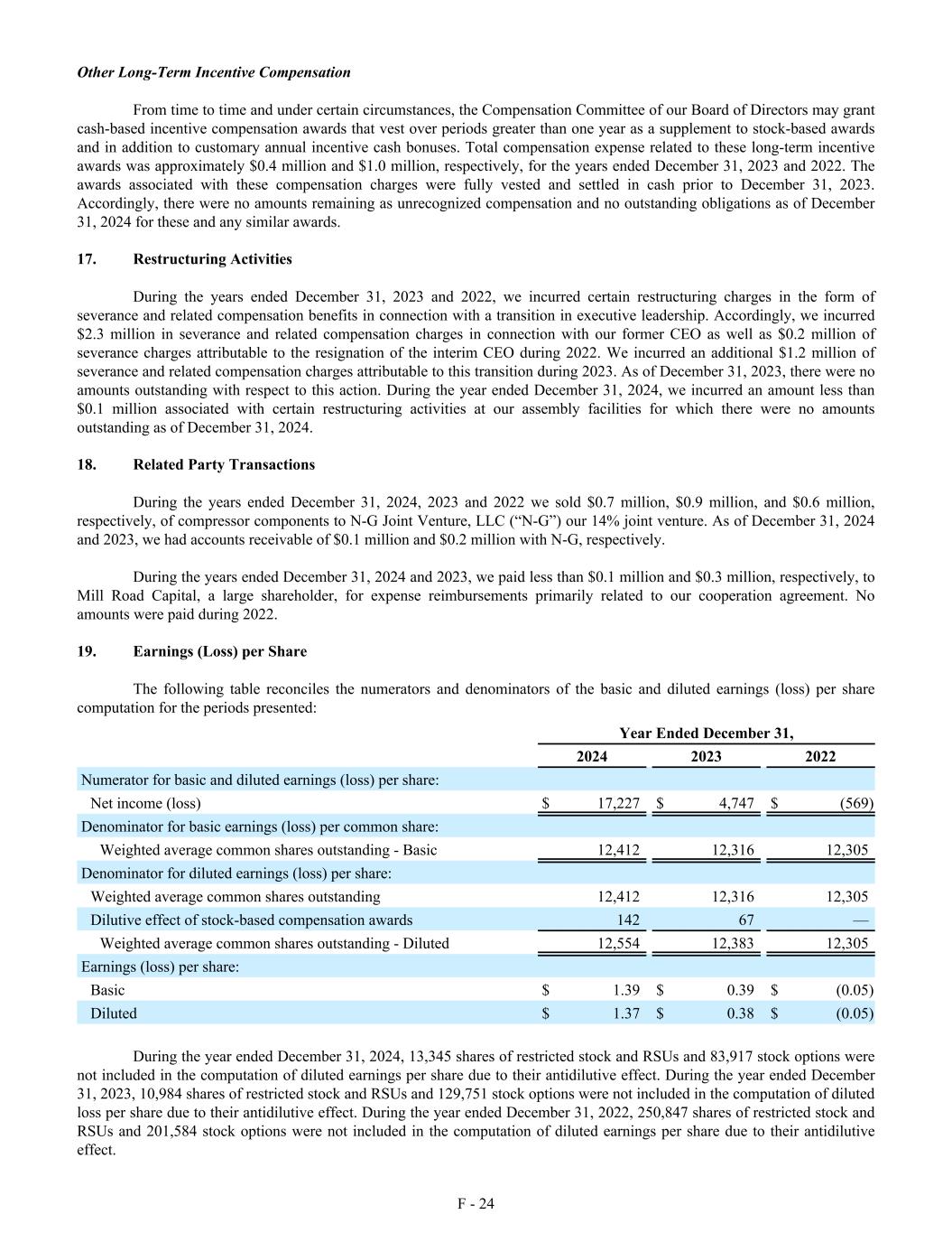Other Long-Term Incentive Compensation From time to time and under certain circumstances, the Compensation Committee of our Board of Directors may grant cash-based incentive compensation awards that vest over periods greater than one year as a supplement to stock-based awards and in addition to customary annual incentive cash bonuses. Total compensation expense related to these long-term incentive awards was approximately $0.4 million and $1.0 million, respectively, for the years ended December 31, 2023 and 2022. The awards associated with these compensation charges were fully vested and settled in cash prior to December 31, 2023. Accordingly, there were no amounts remaining as unrecognized compensation and no outstanding obligations as of December 31, 2024 for these and any similar awards. 17. Restructuring Activities During the years ended December 31, 2023 and 2022, we incurred certain restructuring charges in the form of severance and related compensation benefits in connection with a transition in executive leadership. Accordingly, we incurred $2.3 million in severance and related compensation charges in connection with our former CEO as well as $0.2 million of severance charges attributable to the resignation of the interim CEO during 2022. We incurred an additional $1.2 million of severance and related compensation charges attributable to this transition during 2023. As of December 31, 2023, there were no amounts outstanding with respect to this action. During the year ended December 31, 2024, we incurred an amount less than $0.1 million associated with certain restructuring activities at our assembly facilities for which there were no amounts outstanding as of December 31, 2024. 18. Related Party Transactions During the years ended December 31, 2024, 2023 and 2022 we sold $0.7 million, $0.9 million, and $0.6 million, respectively, of compressor components to N-G Joint Venture, LLC (“N-G”) our 14% joint venture. As of December 31, 2024 and 2023, we had accounts receivable of $0.1 million and $0.2 million with N-G, respectively. During the years ended December 31, 2024 and 2023, we paid less than $0.1 million and $0.3 million, respectively, to Mill Road Capital, a large shareholder, for expense reimbursements primarily related to our cooperation agreement. No amounts were paid during 2022. 19. Earnings (Loss) per Share The following table reconciles the numerators and denominators of the basic and diluted earnings (loss) per share computation for the periods presented: Year Ended December 31, 2024 2023 2022 Numerator for basic and diluted earnings (loss) per share: Net income (loss) $ 17,227 $ 4,747 $ (569) Denominator for basic earnings (loss) per common share: Weighted average common shares outstanding - Basic 12,412 12,316 12,305 Denominator for diluted earnings (loss) per share: Weighted average common shares outstanding 12,412 12,316 12,305 Dilutive effect of stock-based compensation awards 142 67 — Weighted average common shares outstanding - Diluted 12,554 12,383 12,305 Earnings (loss) per share: Basic $ 1.39 $ 0.39 $ (0.05) Diluted $ 1.37 $ 0.38 $ (0.05) During the year ended December 31, 2024, 13,345 shares of restricted stock and RSUs and 83,917 stock options were not included in the computation of diluted earnings per share due to their antidilutive effect. During the year ended December 31, 2023, 10,984 shares of restricted stock and RSUs and 129,751 stock options were not included in the computation of diluted loss per share due to their antidilutive effect. During the year ended December 31, 2022, 250,847 shares of restricted stock and RSUs and 201,584 stock options were not included in the computation of diluted earnings per share due to their antidilutive effect. F - 24